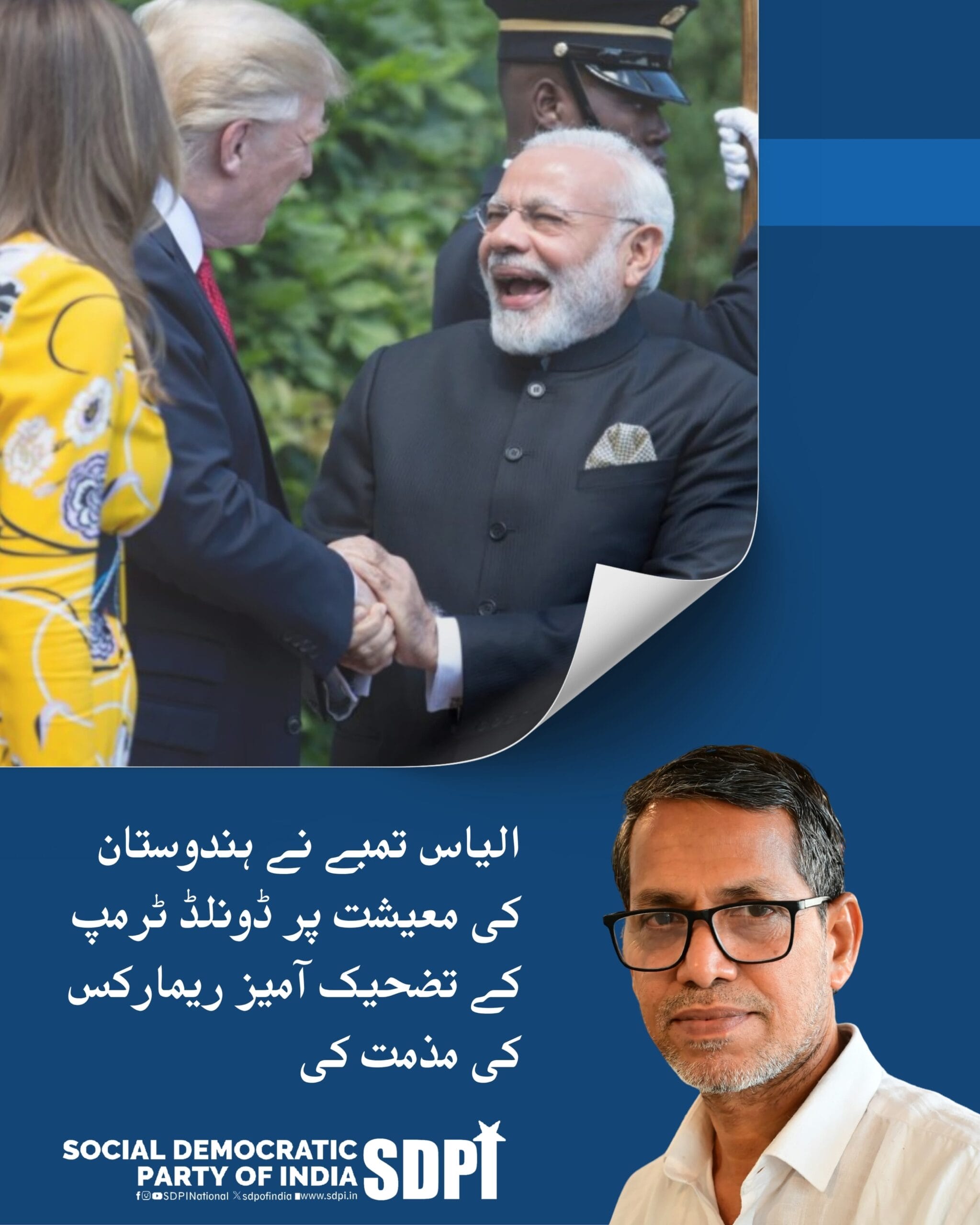 سوشیل ڈیموکریٹک پارٹی آف انڈیا کے قومی جنرل سکریٹری الیاس محمد تھمبے نے امریکی صدر ڈونلڈ ٹرمپ کے حالیہ تضحیک آمیز اور بے بنیاد تبصرہ کی شدید مذمت کی ہے، جس میں انہوں نے ہندوستان کو “مردہ معیشت” قرار دیا ہے۔ اس طرح کا بیان نہ صرف تکبر اور جہالت کی عکاسی کرتا ہے بلکہ اس نوآبادیاتی ذہنیت کی بھی عکاسی کرتا ہے جو مغربی قیادت کے بعض طبقوں کو مسلسل دوچار کر رہی ہے۔ مسٹر ٹرمپ نے اپنے بار بار کے احمقانہ اور اشتعال انگیز بیانات کے ذریعے خود کو سفارتی شائستگی اور معاشی حقیقت سے الگ ظاہر کیا ہے۔ اُن کے خیالات ایک گہری جڑوں والے سامراجی رویے سے جنم لیتے ہیں جو گلوبل ساؤتھ کے ممالک کو ریاستہائے متحدہ کے ماتحت کالونیوں کے طور پر دیکھتا ہے۔