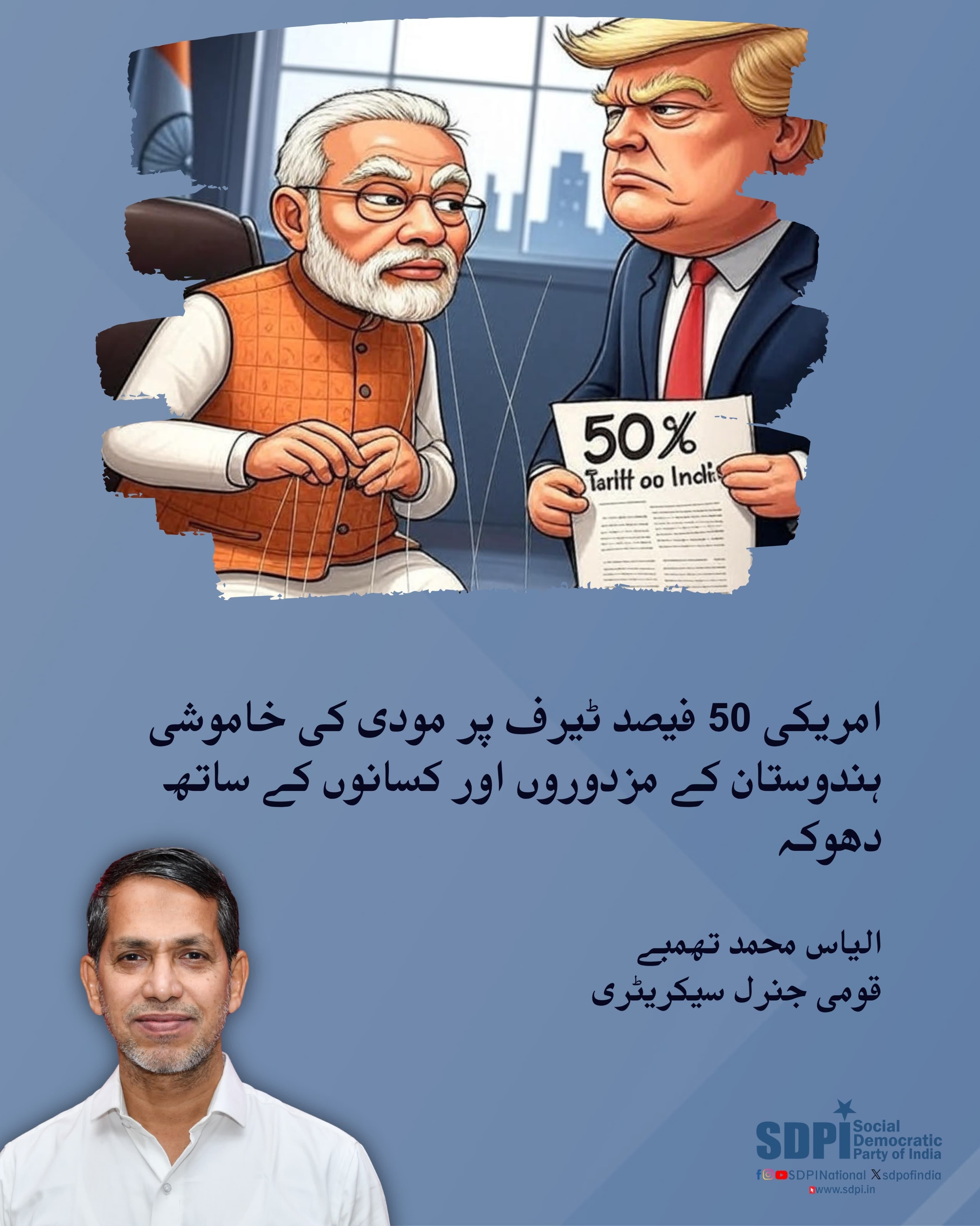 امریکی 50 فیصد ٹیرف پر مودی کی خاموشی ہندوستان کے مزدوروں اور کسانوں کے ساتھ دھوکہ۔ ایس ڈی پی آئی