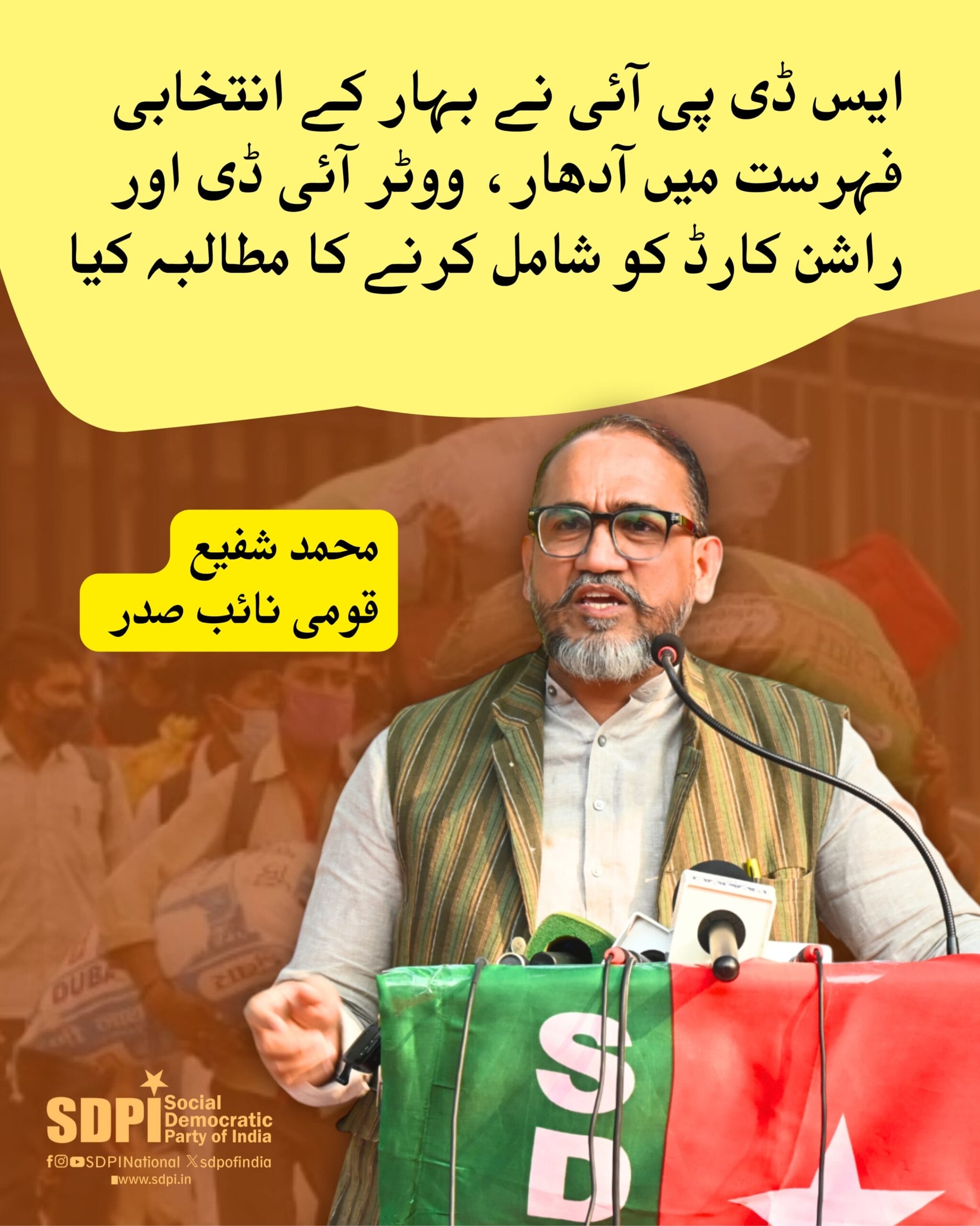 ایس ڈی پی آئی نے بہار کے انتخابی فہرست میں آدھار، ووٹر آئی ڈی اور راشن کارڈ کو شامل کرنے کا مطالبہ کیا