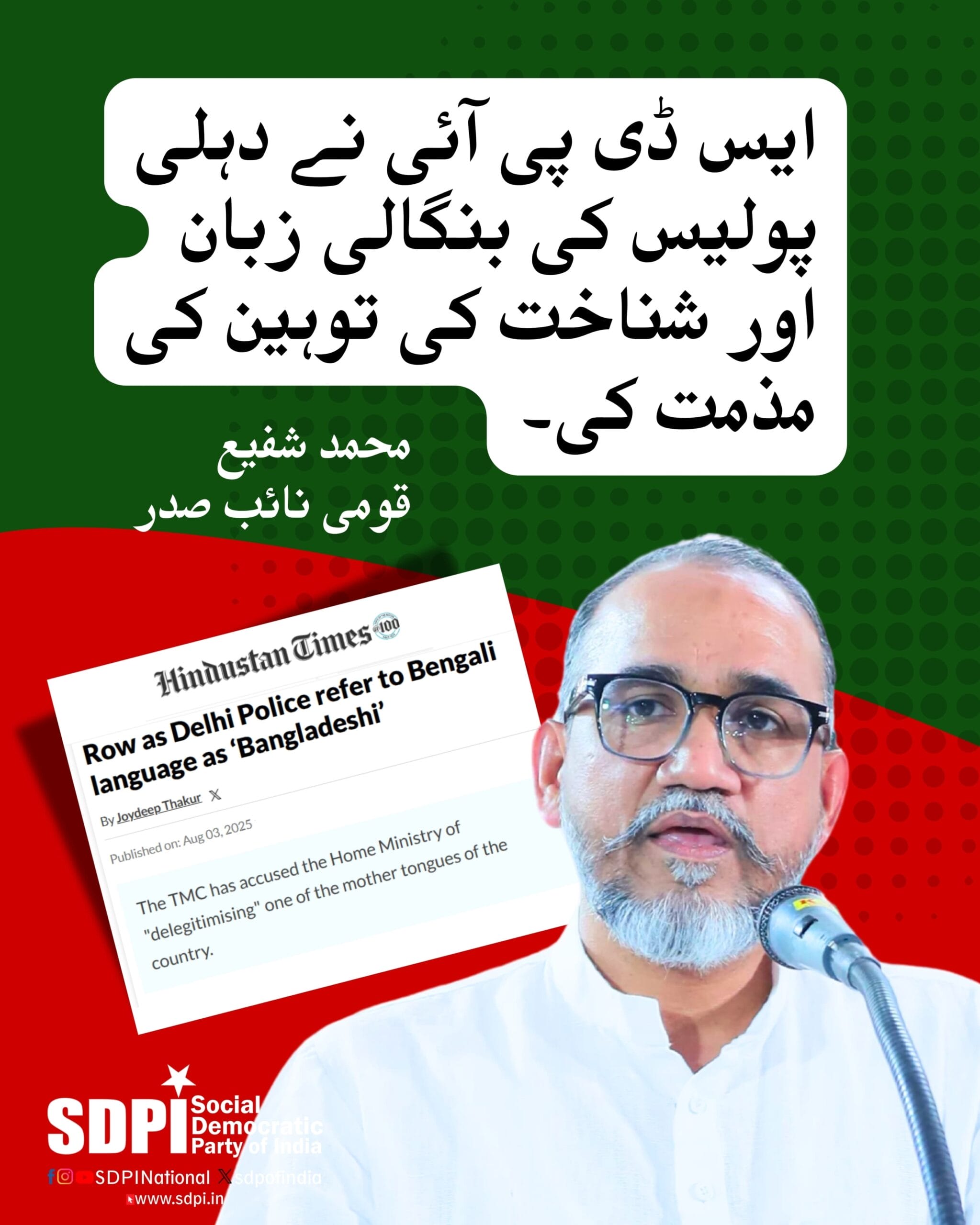 سوشیل ڈیموکریٹک پارٹی آف انڈیا کے قومی نائب صدر محمد شفیع نے 3 اگست 2025 کو لودھی کالونی پولیس اسٹیشن کے انسپکٹر امیت دت کی طرف سے جاری کردہ ایک خط میں بنگالی زبان کو “بنگلہ دیش کی زبان” کے طور پر اشتعال انگیز حوالہ دینے پر دہلی پولیس کی شدید مذمت کی ہے۔