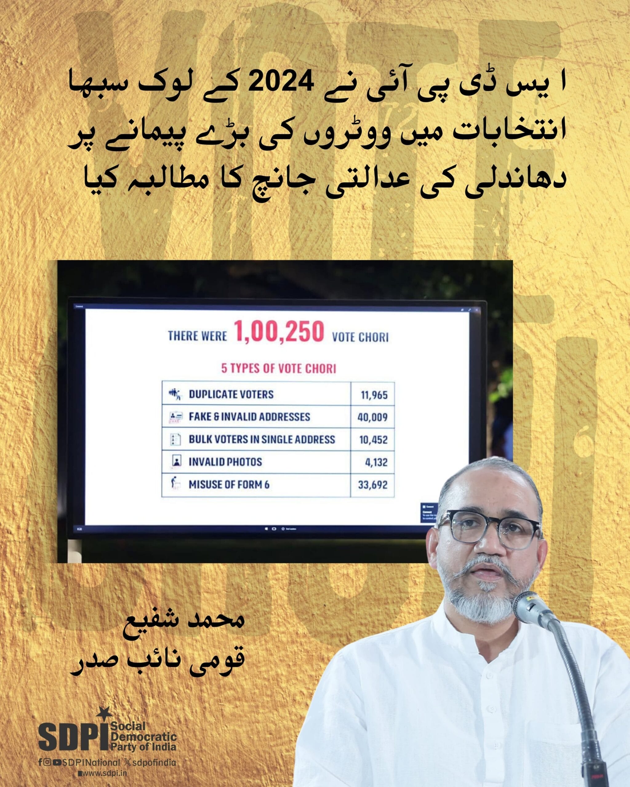 ایس ڈی پی آئی نے 2024 کے لوک سبھا انتخابات میں ووٹروں کی بڑے پیمانے پر دھاندلیوں کی عدالتی جانچ کا مطالبہ کیا