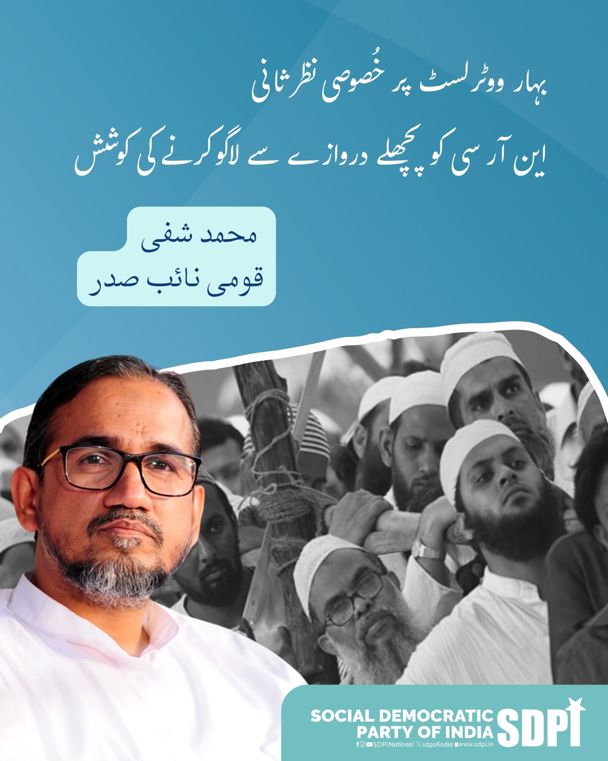 نئی دہلی۔ (پریس ریلیز)۔ سوشیل ڈیموکریٹک پارٹی آف انڈیا کے قومی نائب صدر محمد شفیع نے اپنے جاری کردہ اخباری بیان میں کہا ہے کہ بہار میں آئندہ اسمبلی انتخابات سے عین قبل الیکشن کمیشن کی جانب سے شروع کی گئی ووٹر لسٹ کی خصوصی نظرثانی کا عمل سنگین خدشات کو جنم دے رہا ہے۔ اس اچانک اقدام کو آبادی کے ایک بڑے حصے بالخصوص اقلیتوں اور کمزور طبقات کو حق رائے دہی سے محروم کرنے کی کوشش کے طور پر دیکھا جا رہا ہے۔