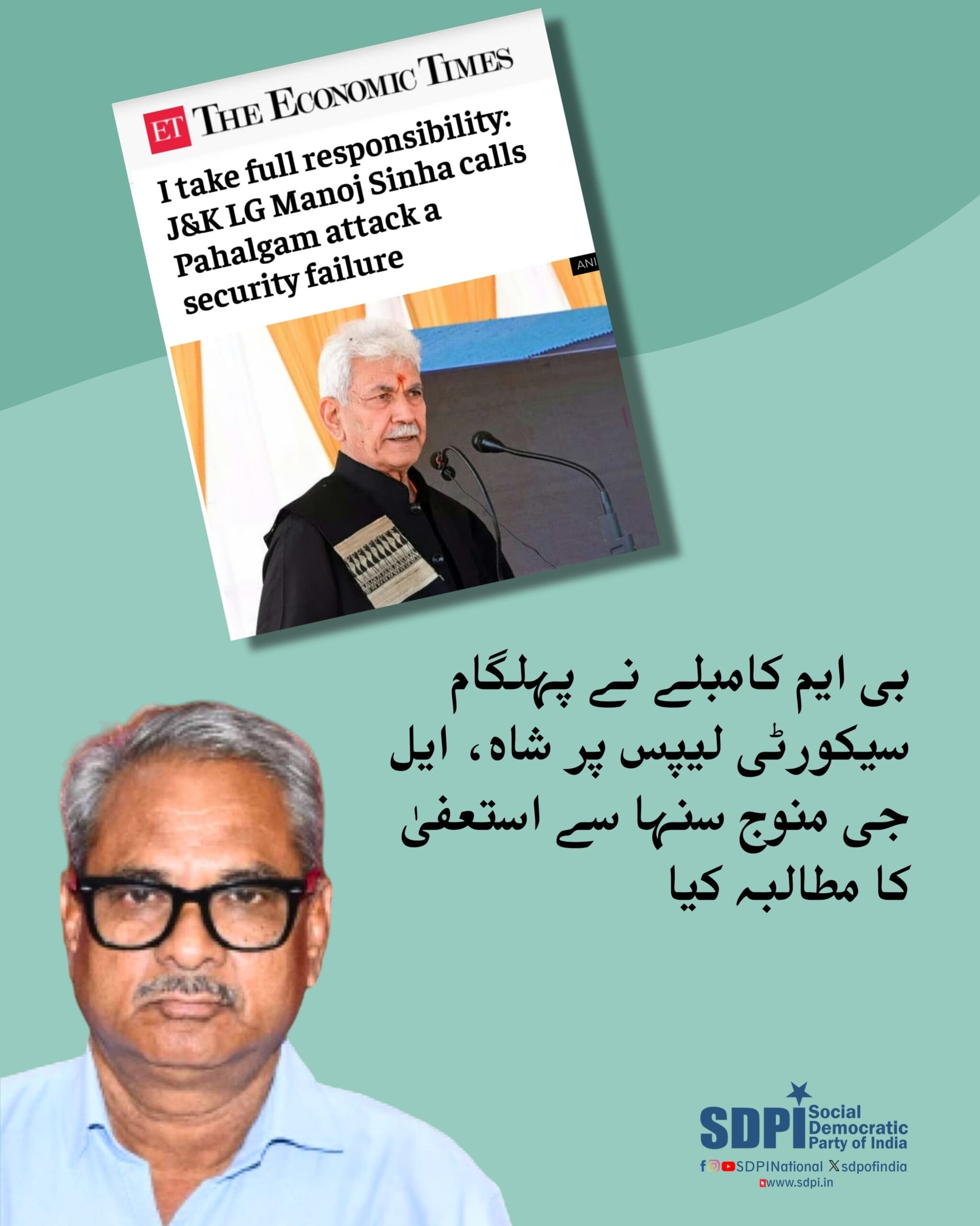نئی دہلی۔ (پریس ریلیز)۔سوشیل ڈیموکریٹک پارٹی آف انڈیا کے قومی نائب صدر بی ایم کامبلے نے مرکزی وزیر داخلہ امیت شاہ اور جموں و کشمیر کے لیفٹیننٹ گورنر منوج سنہا سے جموں و کشمیر کے لوگوں کی حفاظت کو یقینی بنانے میں ان کی مکمل ناکامی کے لیے فوری طور پر استعفیٰ دینے کا مطالبہ کیا ہے، جیسا کہ 22 اپریل 25 کو پہلگام دہشت گردانہ حملے سے واضح طور پر ظاہر ہوا تھا۔