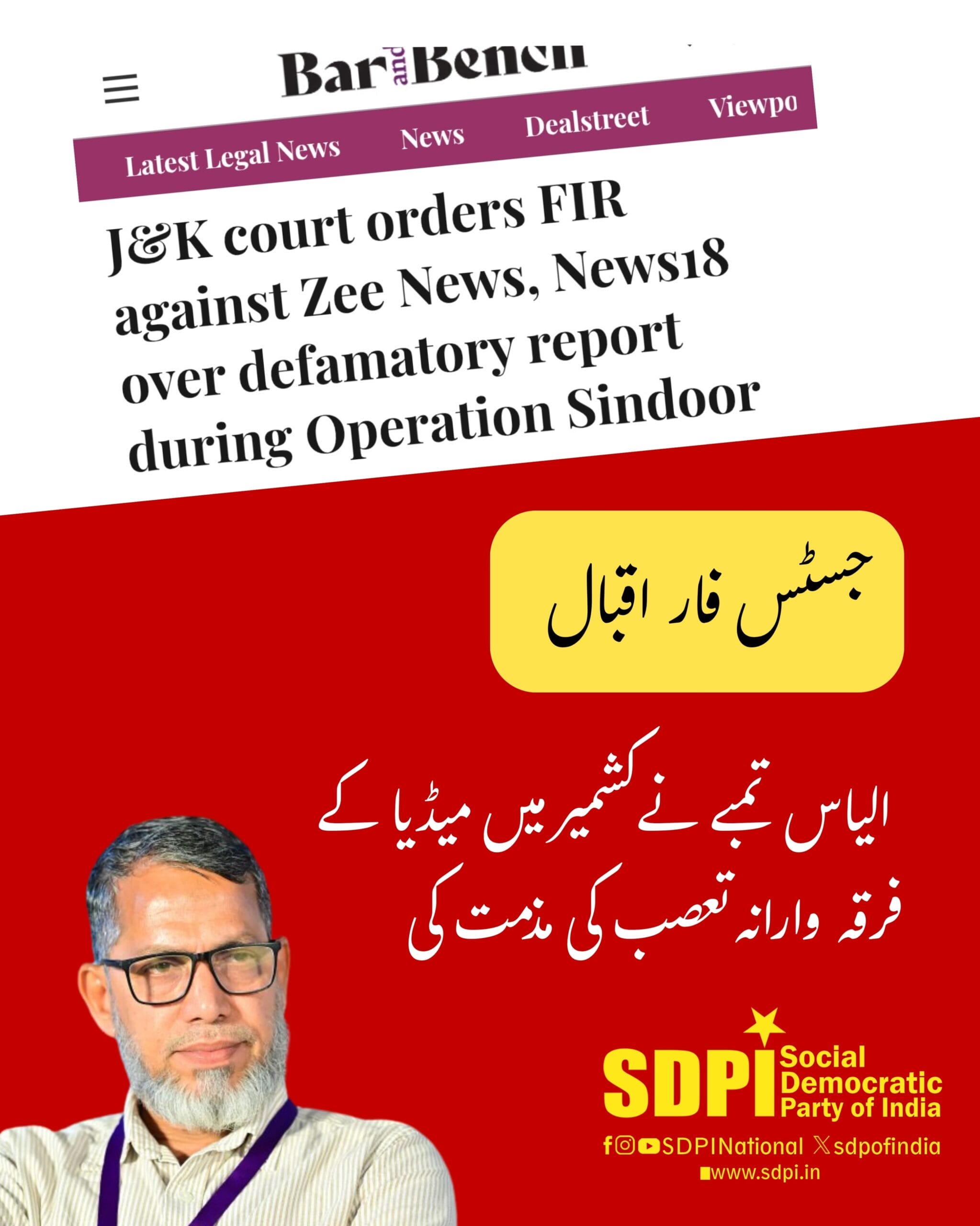 نئی دہلی۔ (پریس ریلیز)۔ سوشیل ڈیموکریٹک پارٹی آف انڈیا کے قومی جنرل سکریٹری الیاس محمد تمبے نے اپنے جاری کردہ اخباری بیان میں کشمیر میں میڈیا رپورٹنگ میں فرقہ وارانہ تعصب کی سخت مذمت کی ہے۔ انہوں نے مزید کہا ہے کہ زی نیوز، نیوز 18 انڈیا اور دیگر چینلز کی جانب سے ایک قابل احترام اسلامی استاد قاری محمد اقبال کو ”پاکستانی دہشت گرد” کے طور پر پیش کیا جانا، بالخصوص انڈیا اور کشمیر کے مسلمانوں کے تئیں میڈیا کے گہرے فرقہ وارانہ تعصب کا واضح ثبوت ہے۔ سوشل ڈیموکریٹک پارٹی آف انڈیا 29 جون 2025 کے پونچھ کورٹ کے حکم کا خیر مقدم کرتی ہے جس میں ان چینلز کے خلاف ہتک عزت کا مقدمہ دائر کرنے کی ہدایت کی گئی تھی۔ یہ فیصلہ انصاف کی طرف ایک اہم قدم ہے، جو ہندوستان کی سیکولر روح کو نقصان پہنچانے والے مہلک دقیانوسی تصورات کو بے نقاب کرتا ہے۔