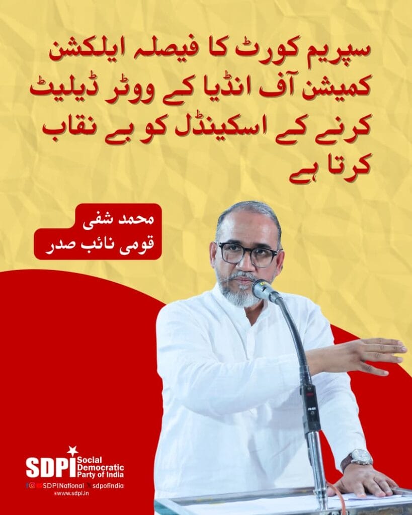 نئی دہلی۔ (پریس ریلیز)۔ سوشیل ڈیموکریٹک پارٹی آف انڈیا کے قومی نائب صد ر محمد شفیع نے اپنے جاری کردہ اخباری بیان میں کہا ہے کہ سپریم کورٹ کی طرف سے ہدایت جس میں الیکشن کمیشن آف انڈیا کو تقریباً 65 لاکھ حذف شدہ ووٹروں کی بوتھ وار تفصیلات شائع کرنے پر مجبور کرنا جمہوریت، شفافیت اور ہر شہری کے آئینی حقوق کی فیصلہ کن فتح ہے۔ جسٹس سوریا کانت اور جویمالیا باغچی کا حکم نہ صرف ہر ایک ووٹر کے حذف کرنے کی واضح وجوہات کو عوام کے سامنے رکھنا لازمی قرار دیتا ہے بلکہ EPIC نمبروں کے ذریعے آن لائن رسائی اور پنچایت اور بلاک دفاتر میں فزیکل ڈسپلے کرنے کو بھی کہا ہے۔ اس کے ساتھ اخبارات، ریڈیو، دوردرشن، اور سوشل میڈیا کے ذریعے وسیع تشہیر کی جانی ہے۔ اہم طور پر، عدالت کی جانب سے آدھار کو حذف کرنے کو چیلنج کرنے کے لیے ایک درست ثبوت کے طور پر قبول کرنا ایک واضح خامی کو بند کرتا ہے، اس بات کو یقینی بناتا ہے کہ کسی بھی اہل ووٹر کو من مانی طور پر ایک طرف نہ ڈالا جائے۔
