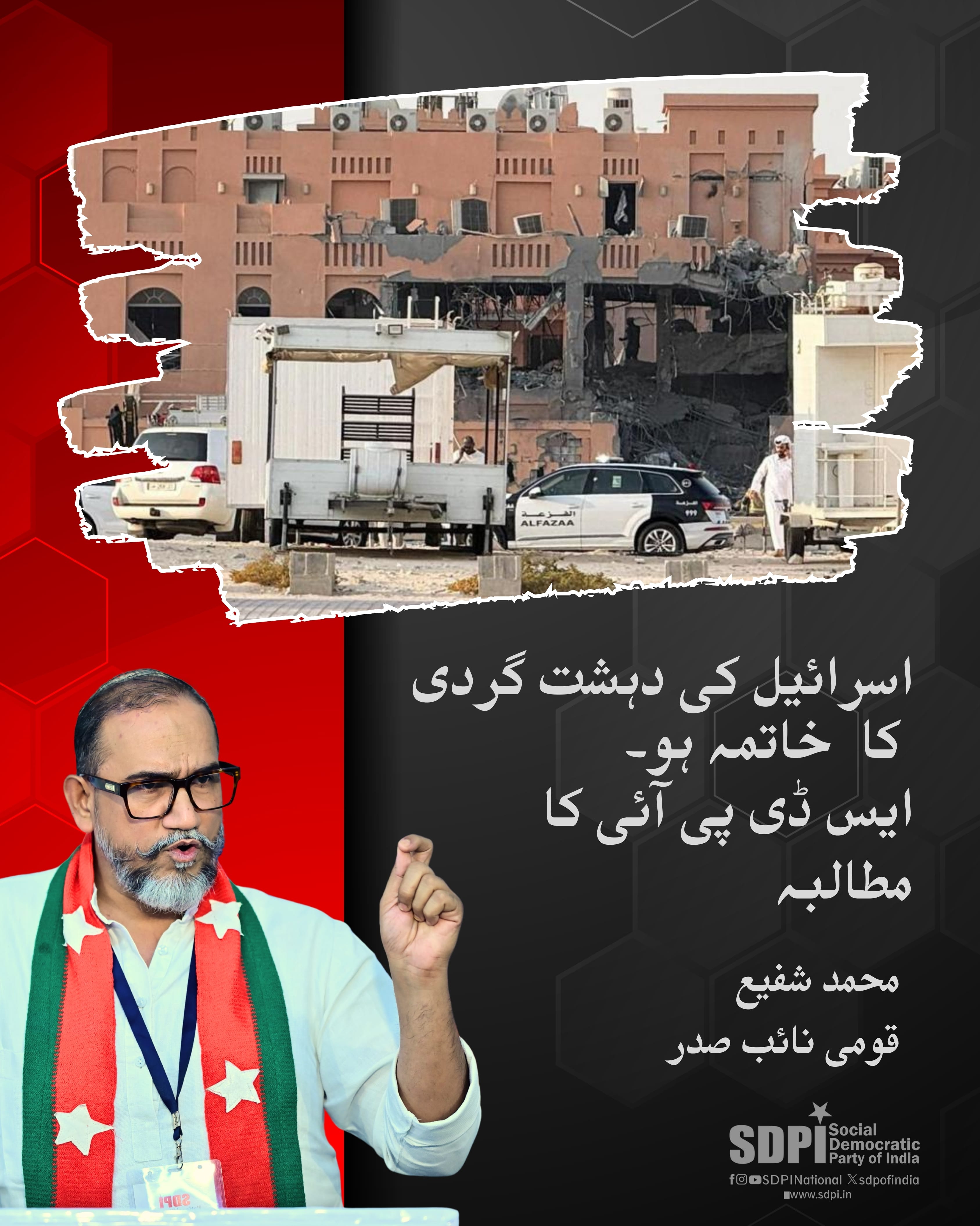 نئی دہلی۔ (پریس ریلیز)۔سوشیل ڈیموکریٹک پارٹی آف انڈیا کے قومی نائب صدر محمد شفیع نے قطر کی خودمختاری پر اسرائیل کے بزدلانہ حملے کی سخت مذمت کی ہے جو کہ بین الاقوامی قوانین اور اصولوں کی ڈھٹائی سے خلاف ورزی ہے۔ دوحہ میں یہ بلا اشتعال حملہ، حماس کی قیادت کو نشانہ بناتے ہوئے، نہ صرف معصوم جانوں کو خطرے میں ڈالتا ہے بلکہ علاقائی امن کی کوششوں میں ثالث کے طور پر قطر کے اہم کردار کو بھی نقصان پہنچاتا ہے۔ اس طرح کی جارحانہ کی کارروائیوں سے اسرائیل کی سفارتی تقدس کی پامالی کا پردہ فاش ہوتا ہے اور اسے عالمی غصے کا سامنا کرنا چاہیے۔