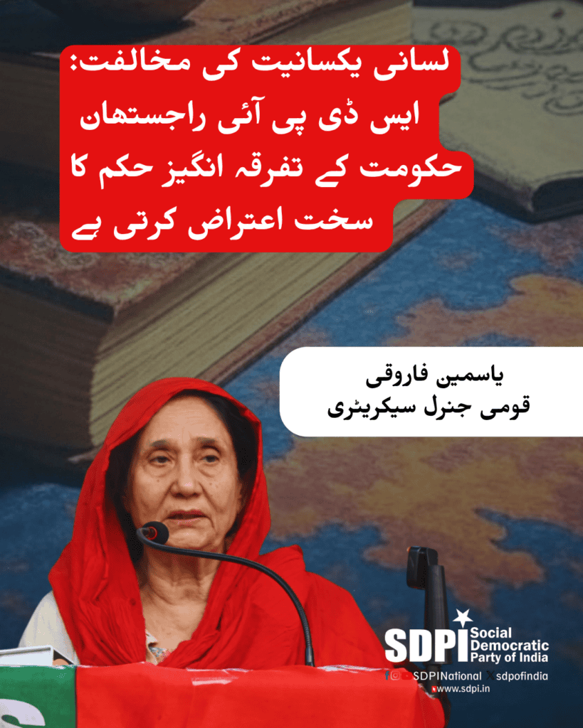 لسانی یکسانیت کی مخالفت: ایس ڈی پی آئی راجستھان حکومت کے تفرقہ انگیز حکم کا سخت اعتراض کرتی ہے
