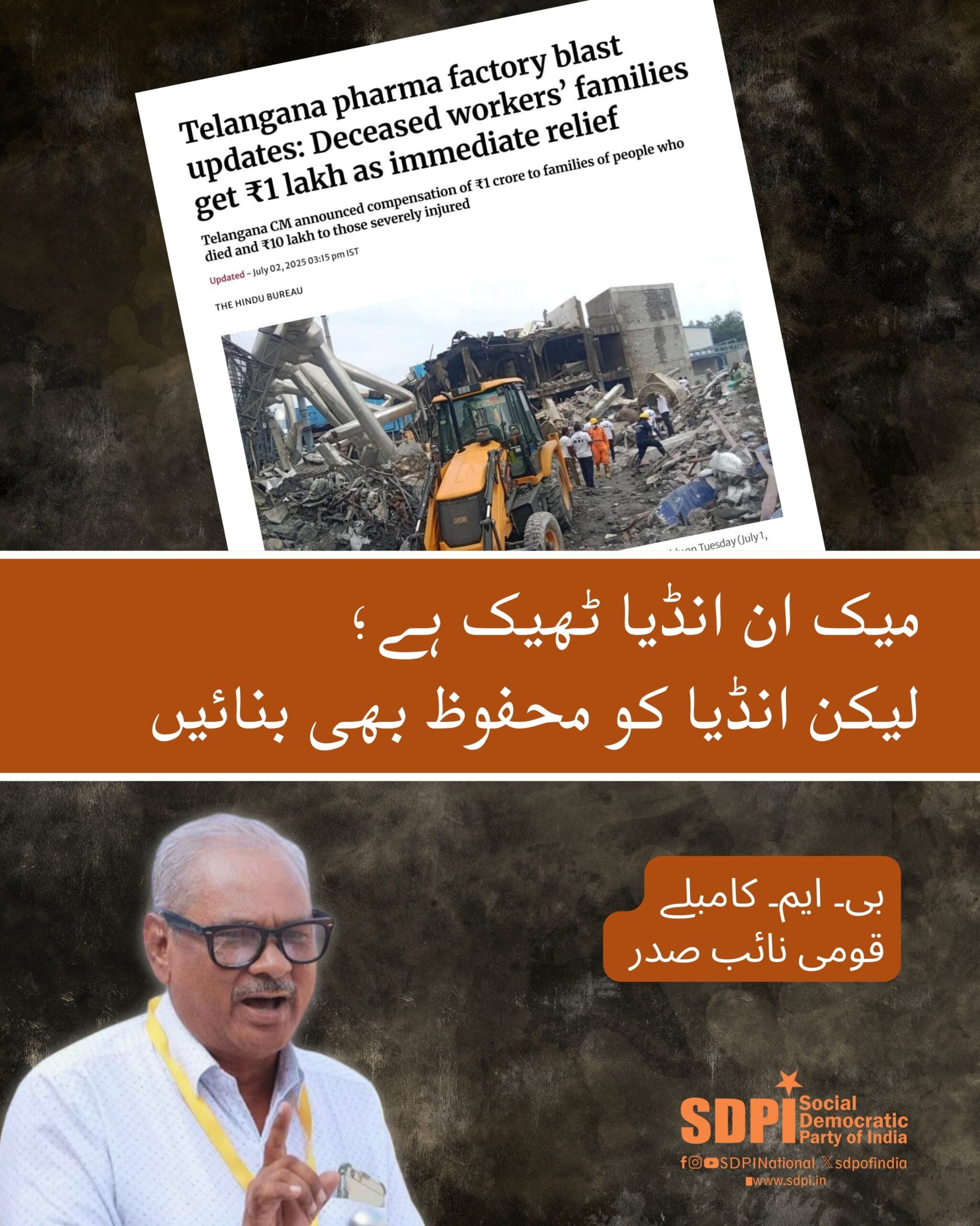 نئی دہلی۔ (پریس ریلیز)۔ سوشیل ڈیموکریٹک پارٹی آف انڈیا کے قومی نائب صدر بی ایم کامبلے نے اپنے جاری کردہ اخباری بیان میں کہا ہے کہ ملک بھر میں دھماکوں، آتش زنی اور دیگر صنعتی حادثات کی حالیہ لہر نے ہندوستانی کام کی جگہوں پر صنعتی تحفظ کی تشویشناک حالت کو اجاگر کیا ہے۔ منگل کو تمل ناڈو کے چنناکمان پٹی میں پٹاخے کی ایک فیکٹری میں زبردست دھماکے میں آٹھ افراد ہلاک ہو گئے تھے، جب کہ پیر کو تلنگانہ کے حیدرآباد میں ایک فارماسیوٹیکل فیکٹری میں زبردست آگ لگنے سے 36 افراد جھلس کر ہلاک ہو گئے تھے۔ یہ دونوں حادثات اندرون ملک اور بیرون ملک میڈیا میں بڑے پیمانے پر رپورٹ ہوئے لیکن ایسے صنعتی حادثات بار بار کیوں ہوتے ہیں اس سوال کا ابھی تک تسلی بخش جواب دینا باقی ہے۔