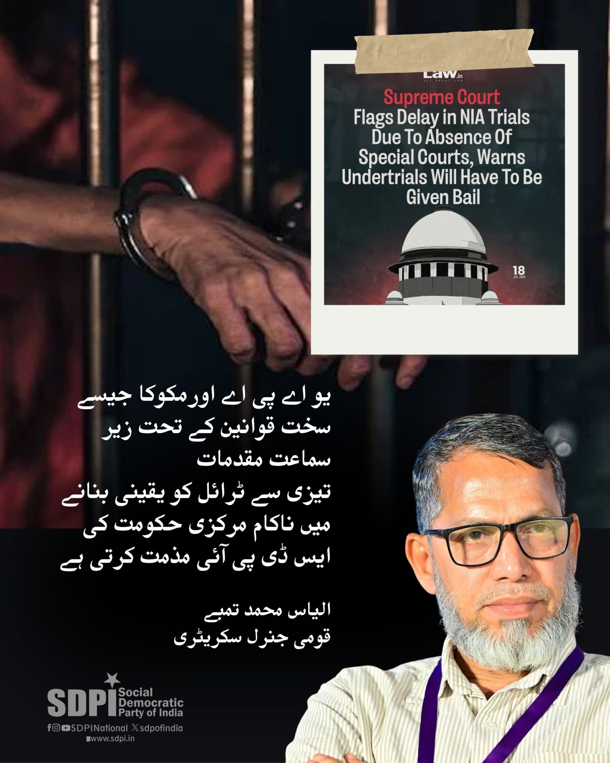 نئی دہلی۔ (پریس ریلیز)۔ سوشیل ڈیموکریٹک پارٹی آف انڈیا کے قومی جنرل سکریٹری الیاس محمد تمبے نے اپنے جاری کردہ اخباری بیان میں مودی حکومت اور اس کی ایجنسیوں کی سخت مذمت کی ہے۔ خاص طور پر قومی تحقیقاتی ایجنسی، غیر قانونی سرگرمیاں (روک تھام) ایکٹ (UAPA) اور مہاراشٹرا سی سی او کنٹرول ایکٹ (MCOCA) جیسے سخت قوانین کے تحت زیر سماعت مقدمات میں تیزی سے ٹرائل کو یقینی بنانے میں مسلسل ناکامی پرپارٹی سخت مذمت کرتی ہے۔ سپریم کورٹ کے حالیہ مشاہدات، این آئی اے ایکٹ، 2008 کے تحت مقرر کردہ خصوصی عدالتوں کے قیام میں مرکزی حکومت کی سنگین غفلت کو بے نقاب کرتے ہیں، جس کے نتیجے میں بروقت انصاف کے بغیر لوگوں کو طویل عرصے تک حراست میں رکھا جاتا ہے۔