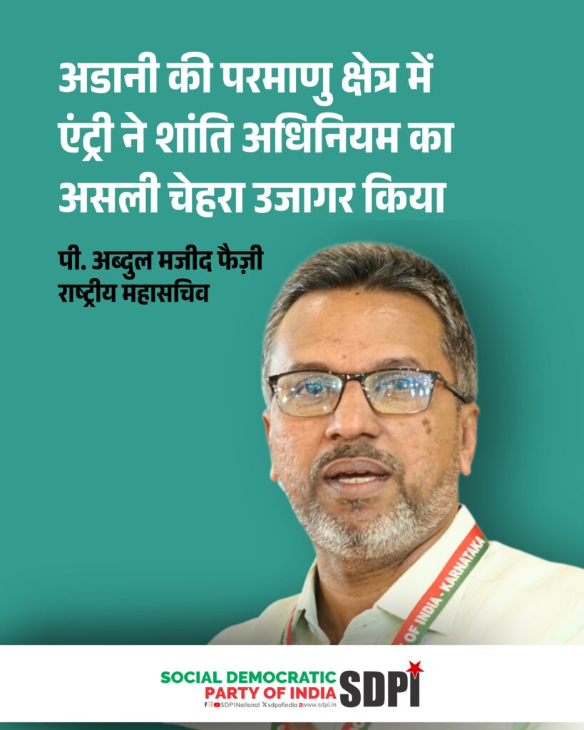 यह खुला पक्षपात शासन व्यवस्था में विश्वास को कमजोर करता है और लोगों की अपेक्षा मुनाफे को प्राथमिकता देता है। एसडीपीआई शांति अधिनियम को तत्काल निरस्त करने, इसके जल्दबाजी में पारित होने की संसदीय जांच कराने और सभी निजी परमाणु पहलों पर रोक लगाने की मांग करती है। भारत को अपना ऊर्जा भविष्य अपने नागरिकों के हित में वापस हासिल करना होगा, न कि कुछ गिने-चुने कॉरपोरेट समूहों के लिए।