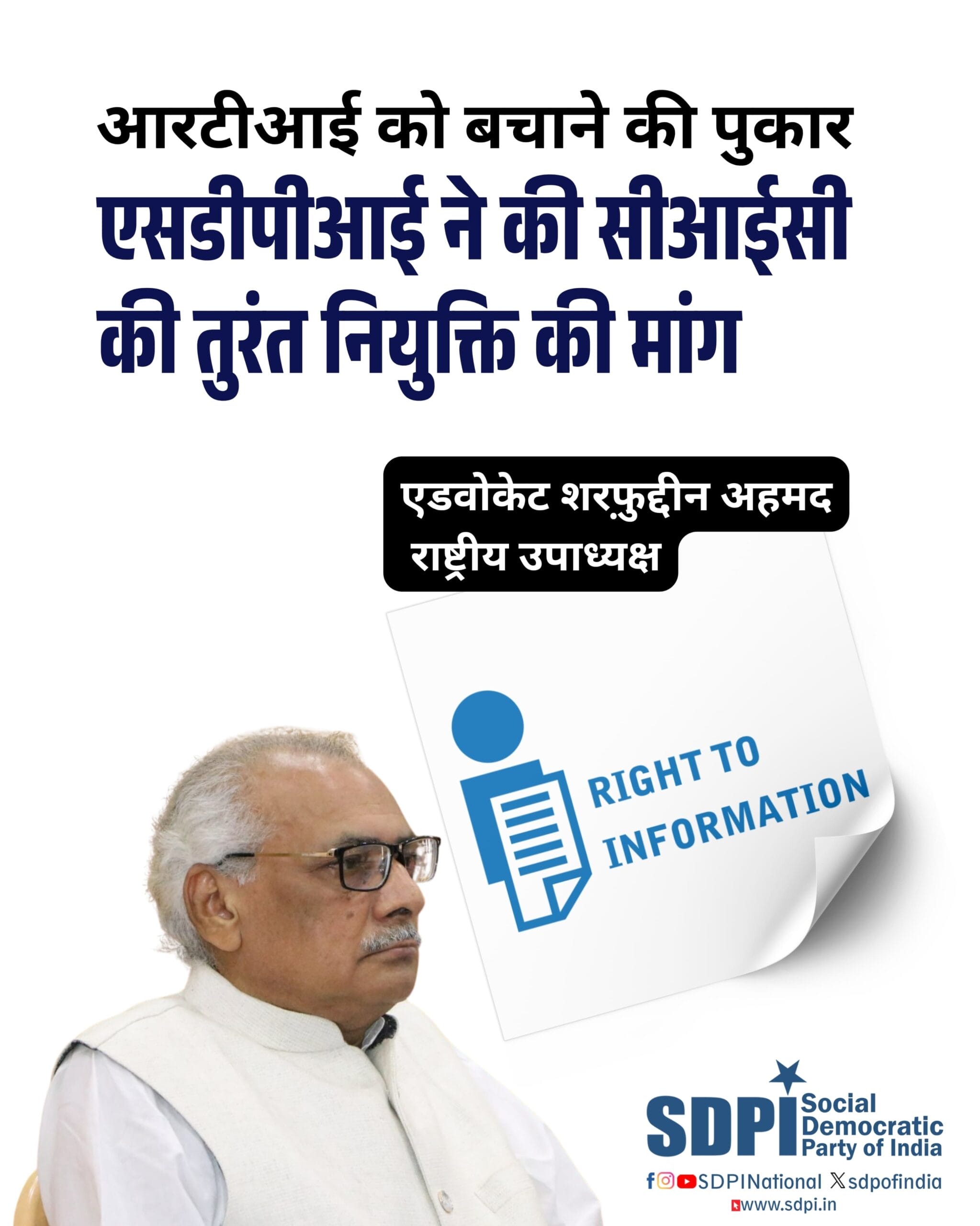 सोशल डेमोक्रेटिक पार्टी ऑफ इंडिया के राष्ट्रीय उपाध्यक्ष एडवोकेट शरफ़ुद्दीन अहमद ने केंद्र सरकार द्वारा केंद्रीय सूचना आयोग (सीआईसी) में आठ रिक्त सूचना आयुक्त पदों को भरने में लगातार विफल रहने की कड़ी निंदा की है। यह नियुक्तियाँ 14 अगस्त, 2024 को आवेदन आमंत्रित करने के लगभग एक वर्ष बाद भी लंबित हैं। राष्ट्रीय उपाध्यक्ष के रूप में मैं इस जानबूझकर की गई निष्क्रियता से स्तब्ध हूं, जो वर्ष 2005 के सूचना का अधिकार (आरटीआई) अधिनियम — जो लोकतांत्रिक पारदर्शिता का मूल स्तंभ है — को कमजोर करती है।