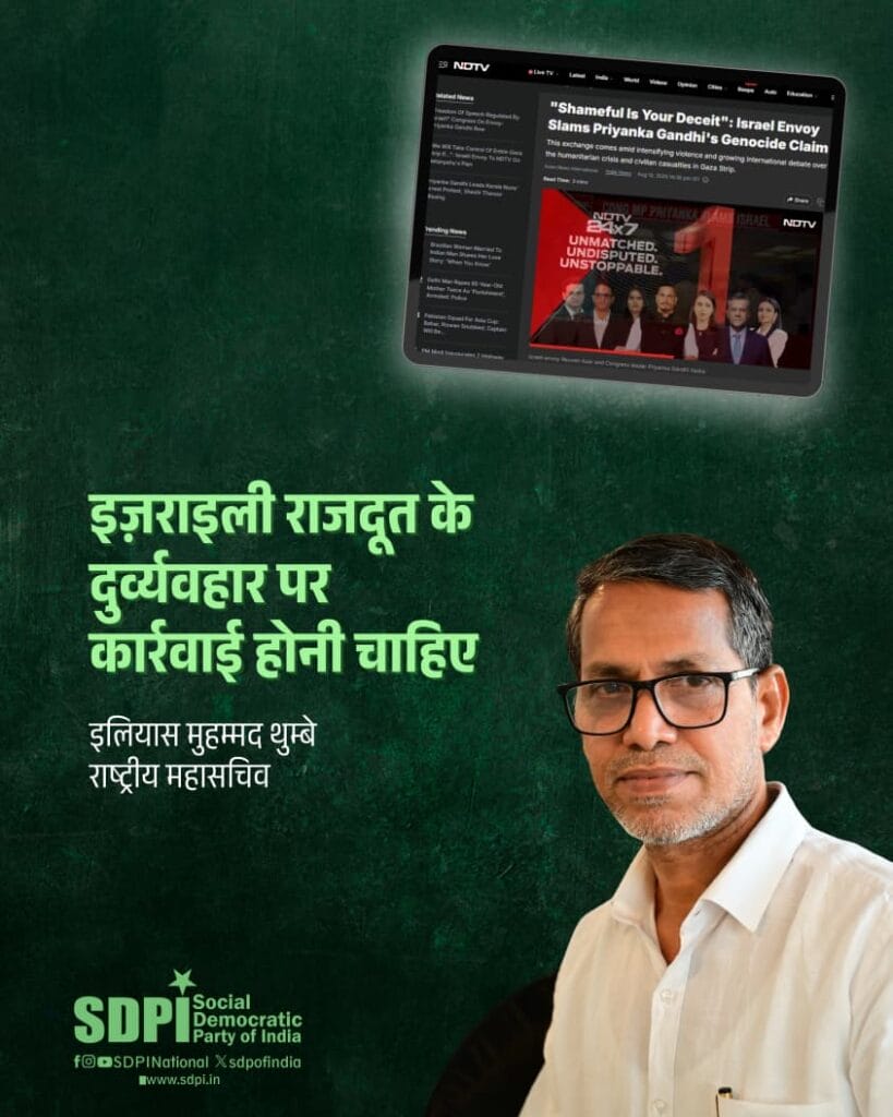 लोकसभा सदस्य श्रीमती प्रियंका गांधी वाड्रा द्वारा गाज़ा में फ़िलिस्तीनी जनता पर इज़राइल के हमलों की सार्वजनिक आलोचना पर हिंदुस्तान में इज़राइल के राजदूत की अत्यंत असंयमित टिप्पणी, हिंदुस्तान की लोकतांत्रिक राजनीतिक परंपराओं पर इज़राइली अधिकारियों का एक खुला हमला है और इसे गंभीरता से लिया जाना चाहिए।
