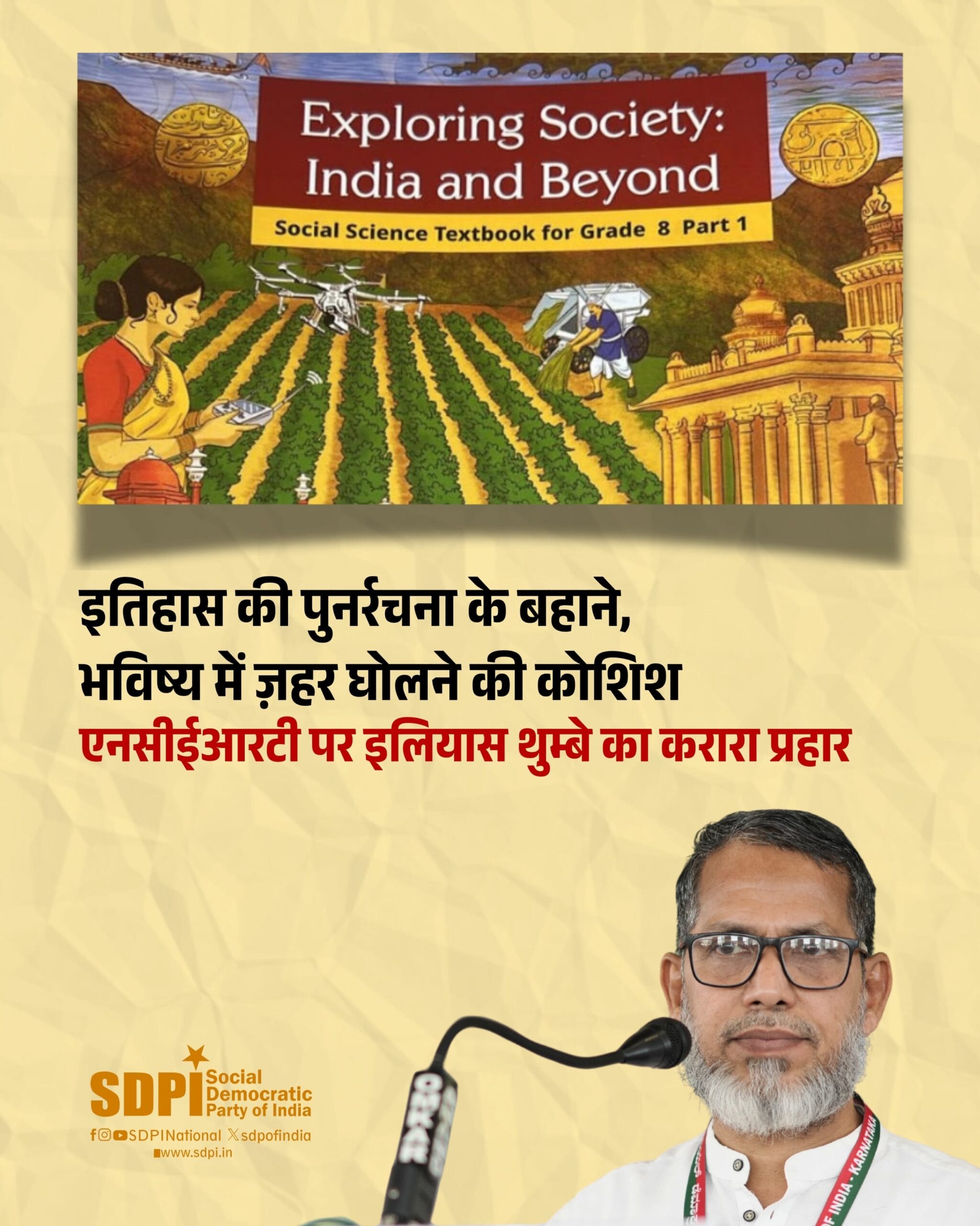 सोशल डेमोक्रेटिक पार्टी ऑफ इंडिया के राष्ट्रीय महासचिव इलियास मुहम्मद थुम्बे ने कक्षा 8 की सामाजिक विज्ञान की पाठ्यपुस्तक Exploring Society: India and Beyond – Part 1 में किए गए संशोधन की कड़ी निंदा की है, जो 2025–26 शैक्षणिक वर्ष के लिए लागू की गई है। बाबर, अकबर और औरंगज़ेब जैसे मुगल सम्राटों को केवल “लुटेरे” के रूप में चित्रित करना, जबकि उनके योगदान को पूरी तरह से नजरअंदाज़ करना, भारत के समृद्ध और बहुलतावादी इतिहास की एक सुनियोजित विकृति है।