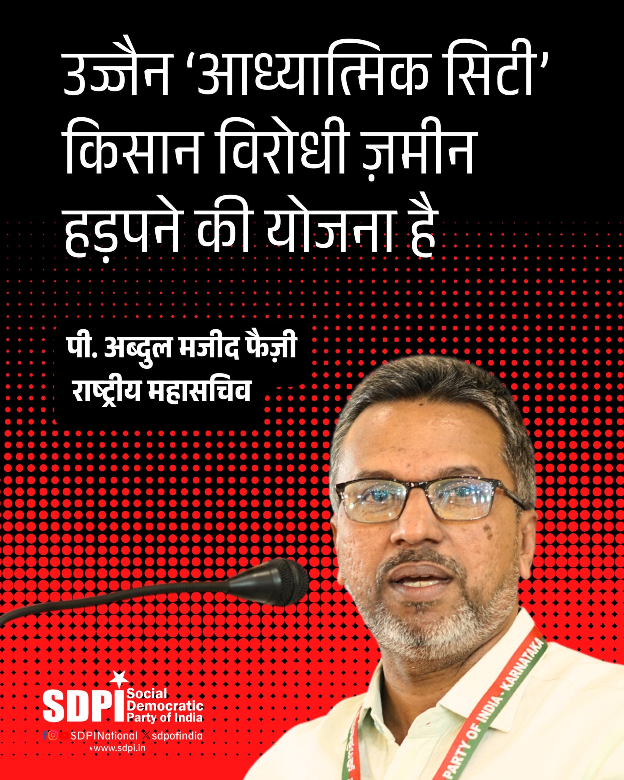 सोशल डेमोक्रेटिक पार्टी ऑफ इंडिया (एसडीपीआई) के राष्ट्रीय महासचिव पी अब्दुल मजीद फैज़ी ने भाजपा शासित मध्यप्रदेश सरकार की प्रस्तावित “आध्यात्मिक सिटी” परियोजना की कड़ी निंदा की है। उन्होंने इसे किसानों की आजीविका और आम जनता के अधिकारों पर हमला करार दिया। फैज़ी ने कहा कि यह योजना मोदी सरकार की किसान विरोधी नीतियों को दर्शाती है, जिसमें कॉर्पोरेट लालच और चुनावी फायदे को सामाजिक न्याय से ऊपर रखा जाता है।