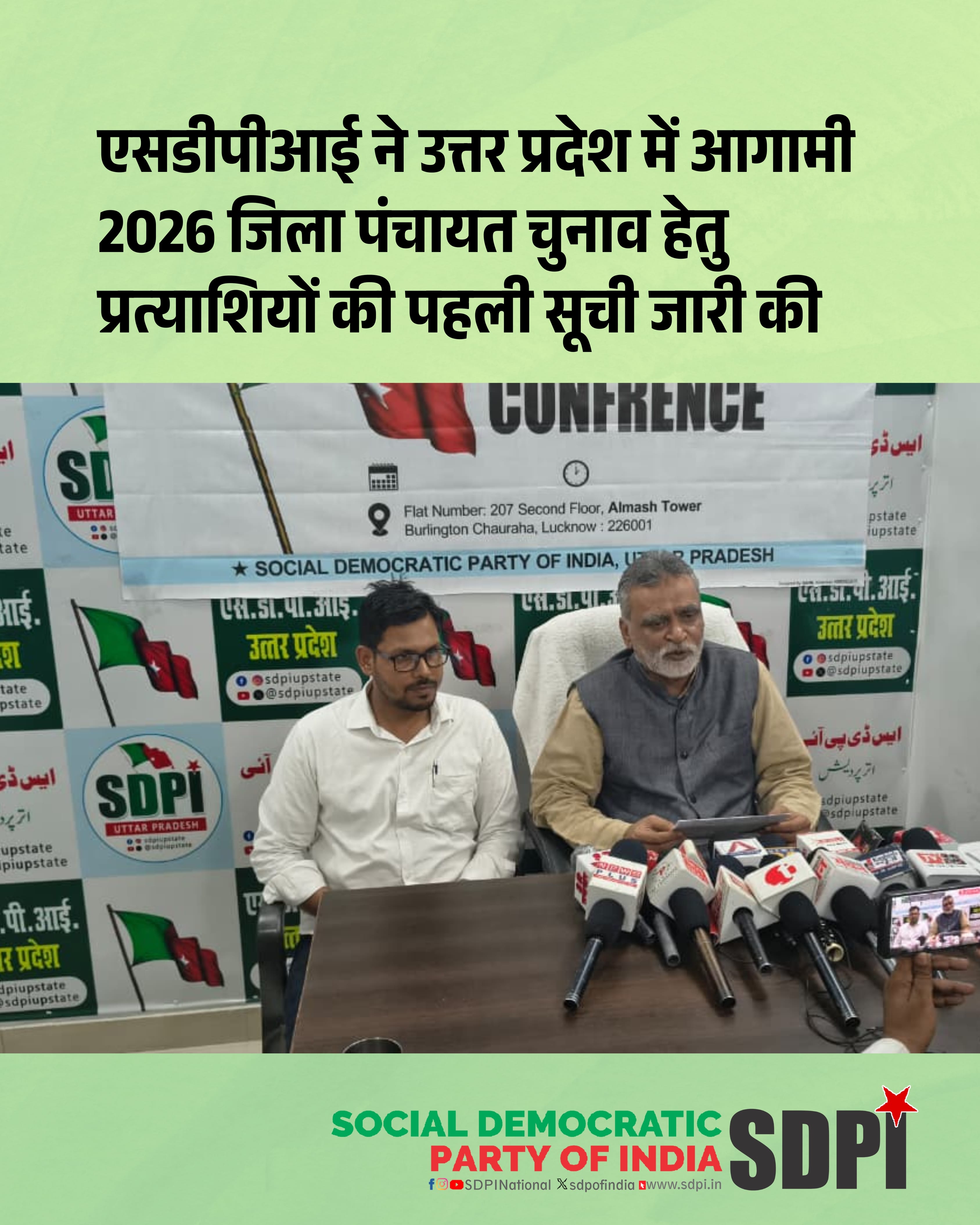सोशल डेमोक्रेटिक पार्टी ऑफ इंडिया (SDPI) उत्तर प्रदेश के प्रदेश अध्यक्ष श्री निज़ामुद्दीन ख़ान ने आज प्रदेश कार्यालय, लखनऊ में आयोजित प्रेस कॉन्फ़्रेंस के माध्यम से आगामी 2026 जिला पंचायत चुनाव हेतु पार्टी के प्रत्याशियों की पहली सूची जारी की।
