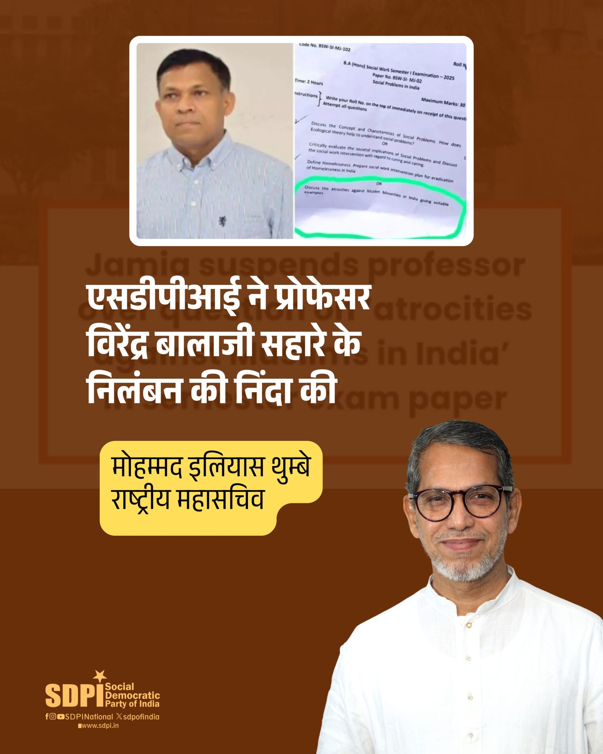 सोशल डेमोक्रेटिक पार्टी ऑफ इंडिया के राष्ट्रीय महासचिव मोहम्मद इलियास थुम्बे ने जामिया मिल्लिया इस्लामिया के सामाजिक कार्य विभाग में वरिष्ठ दलित शिक्षक प्रोफेसर विरेंद्र बालाजी सहारे के मनमाने निलंबन की कड़ी निंदा की है। यह निलंबन परीक्षा प्रश्नपत्र में एक वैध शैक्षणिक प्रश्न शामिल करने के कारण किया गया है। एसडीपीआई इस घटना को शैक्षणिक स्वतंत्रता और बौद्धिक जिज्ञासा पर एक खुला हमला मानती है।