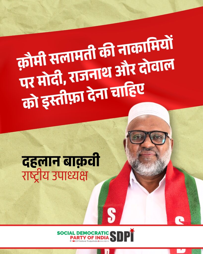 सोशल डेमोक्रेटिक पार्टी ऑफ इंडिया के राष्ट्रीय उपाध्यक्ष दहलान बाक़वी ने कहा कि प्रधानमंत्री नरेंद्र मोदी, रक्षा मंत्री राजनाथ सिंह और राष्ट्रीय सुरक्षा सलाहकार अजीत डोवाल को तत्काल इस्तीफा देना चाहिए, क्योंकि उनकी भूमिका के कारण गंभीर राष्ट्रीय सुरक्षा विफलताएं हुई हैं, जिनसे हिंदुस्तान की क्षेत्रीय अखंडता को नुकसान पहुंचा और लोकतांत्रिक जवाबदेही कमजोर हुई।