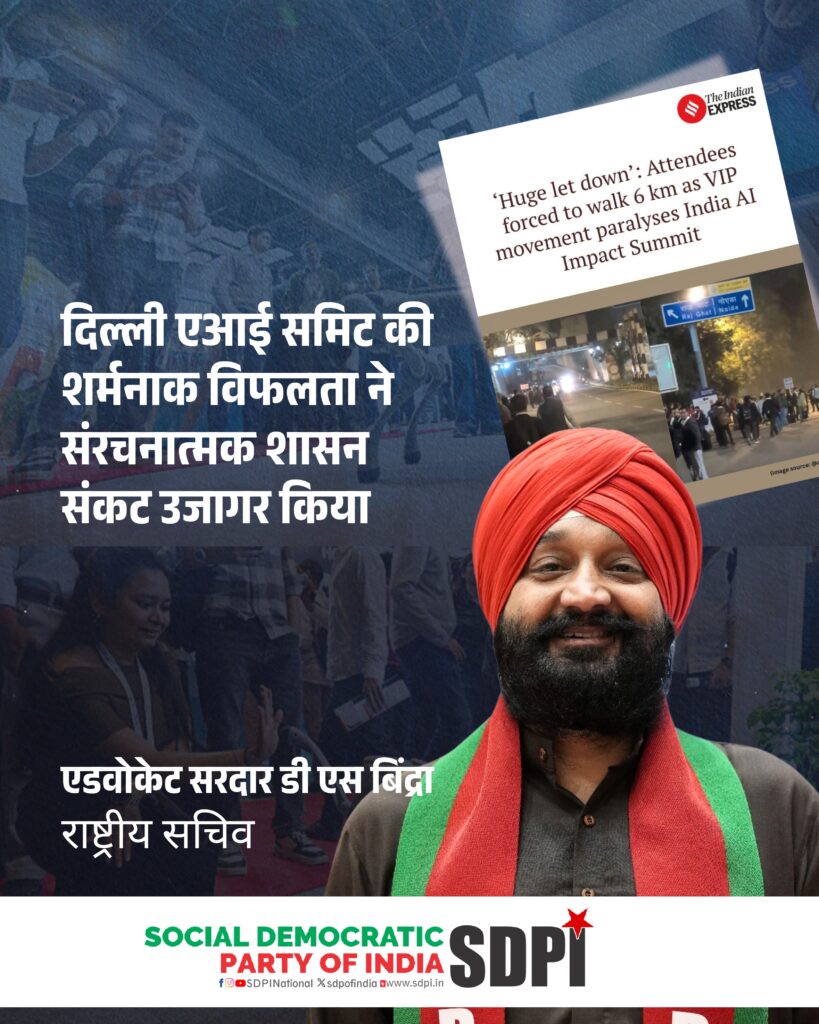 सोशल डेमोक्रेटिक पार्टी ऑफ इंडिया के राष्ट्रीय सचिव एडवोकेट सरदार डी एस बिंद्रा ने नई दिल्ली में आयोजित इंडिया एआई इम्पैक्ट समिट 2026 को घेरने वाली शर्मिंदगी और कुप्रबंधन की परतों की कड़ी निंदा करते हुए विशेष रूप से गलगोटियास विश्वविद्यालय से जुड़े विवाद पर गंभीर चिंता व्यक्त की है। यह वही संस्थान है जिसे वर्ष 2014 में शैक्षणिक उत्कृष्टता और वैश्विक संबंधों के लिए सार्वजनिक रूप से नरेंद्र मोदी द्वारा सम्मानित किया गया था, किंतु अब यह एक व्यावसायिक रूप से उपलब्ध चीनी रोबोटिक कुत्ते को अपने सेंटर ऑफ एक्सीलेंस की स्वदेशी उपलब्धि के रूप में प्रस्तुत करने के कारण उजागर हुआ है। व्यापक जन आलोचना और आधिकारिक हस्तक्षेप के बाद विश्वविद्यालय से प्रदर्शनी स्थल खाली कराए जाने की घटना उन राष्ट्रीय आयोजनों में बढ़ते दिखावे, बढ़ा चढ़ाकर किए गए दावों और कमजोर जवाबदेही की चिंताजनक संस्कृति को सामने लाती है, जिनका उद्देश्य हिंदुस्तान की तकनीकी क्षमता को प्रदर्शित करना बताया जाता है।