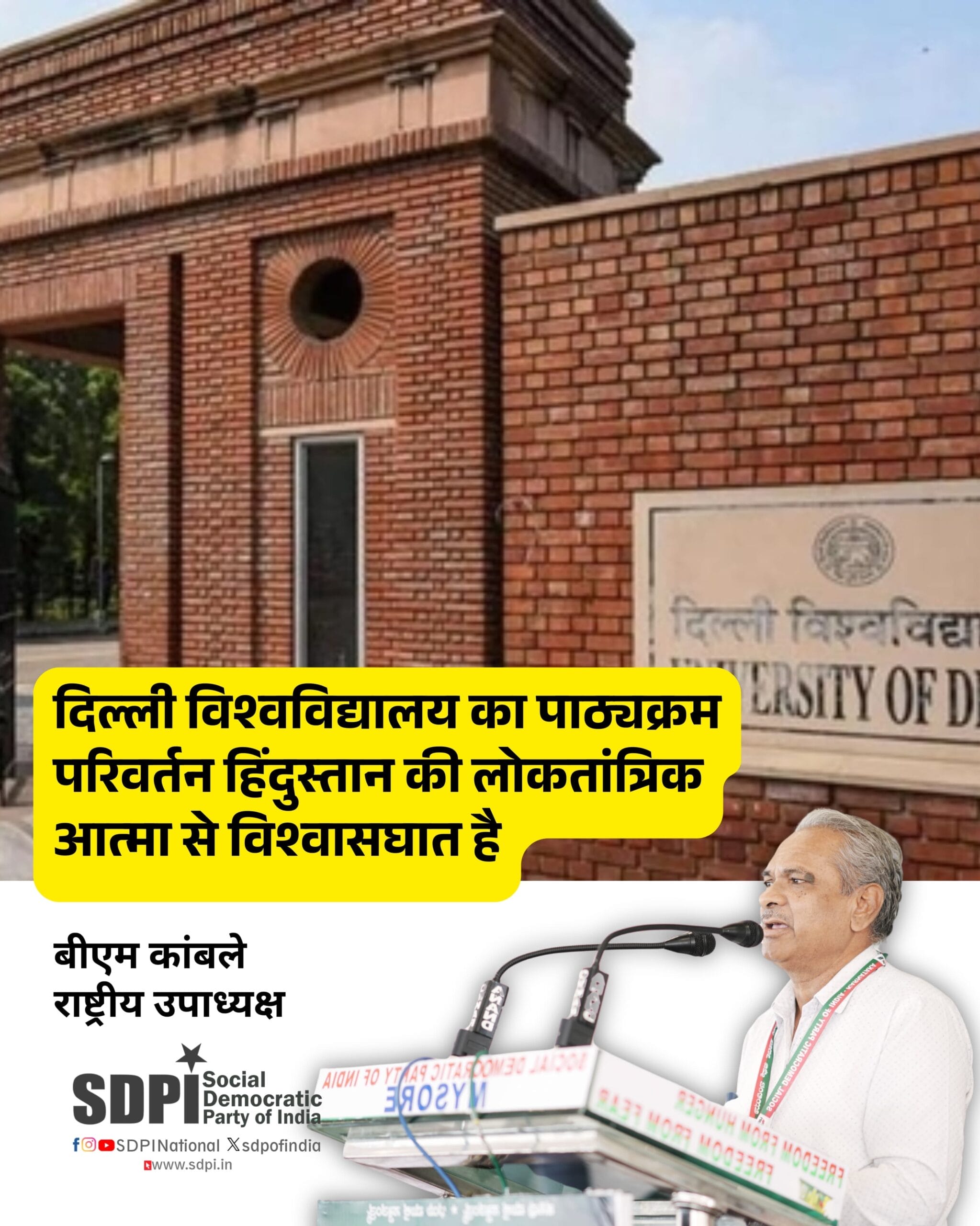 सोशल डेमोक्रेटिक पार्टी ऑफ इंडिया के राष्ट्रीय उपाध्यक्ष बीएम कांबले ने दिल्ली विश्वविद्यालय की अकादमिक मामलों की स्थायी समिति द्वारा हाल ही में राजनीतिक विज्ञान, भूगोल और समाजशास्त्र के स्नातकोत्तर पाठ्यक्रमों से महत्वपूर्ण पाठ्यक्रमों और विषयों को हटाने की सिफारिशों की कड़े शब्दों में निंदा की है। उन्होंने इसे उच्च शिक्षा में अकादमिक स्वतंत्रता, बौद्धिक ईमानदारी और सत्य की खोज पर एक सीधा हमला बताया है। एसडीपीआई इस निर्णय के विरुद्ध संघर्षरत शिक्षकों, छात्रों और अकादमिक समुदाय के साथ एकजुटता में खड़ी है।