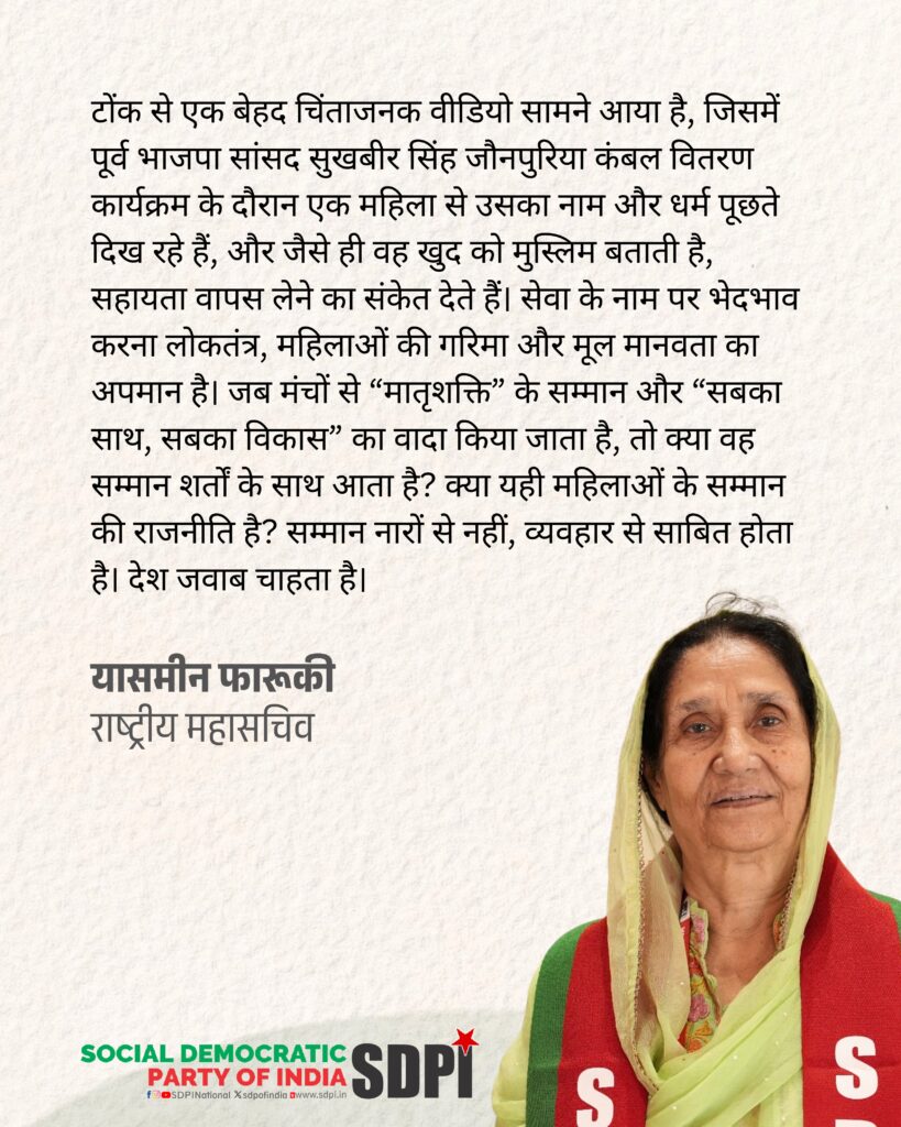 टोंक से एक बेहद चिंताजनक वीडियो सामने आया है, जिसमें पूर्व भाजपा सांसद सुखबीर सिंह जौनपुरिया कंबल वितरण कार्यक्रम के दौरान एक महिला से उसका नाम और धर्म पूछते दिख रहे हैं, और जैसे ही वह खुद को मुस्लिम बताती है, सहायता वापस लेने का संकेत देते हैं। सेवा के नाम पर भेदभाव करना लोकतंत्र, महिलाओं की गरिमा और मूल मानवता का अपमान है। जब मंचों से “मातृशक्ति” के सम्मान और “सबका साथ, सबका विकास” का वादा किया जाता है, तो क्या वह सम्मान शर्तों के साथ आता है? क्या यही महिलाओं के सम्मान की राजनीति है? सम्मान नारों से नहीं, व्यवहार से साबित होता है। देश जवाब चाहता है।