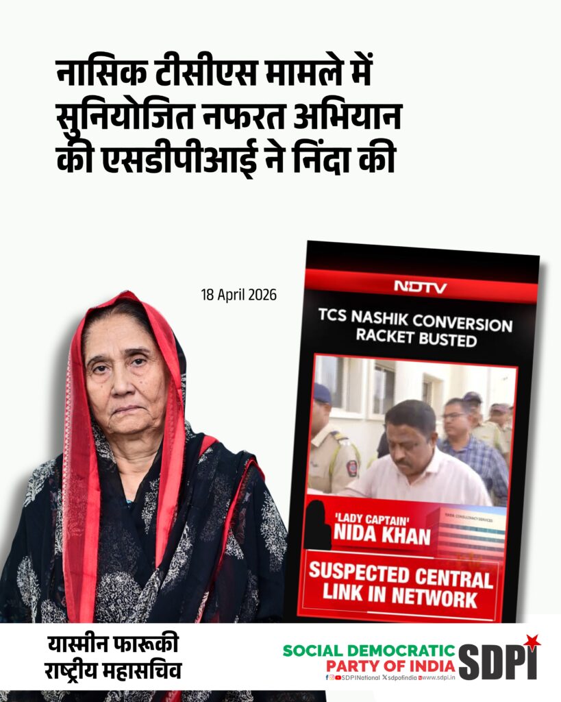 सोशल डेमोक्रेटिक पार्टी ऑफ इंडिया की राष्ट्रीय महासचिव यास्मीन फारूकी ने नासिक स्थित टीसीएस बीपीओ इकाई में कथित यौन उत्पीड़न और धार्मिक दबाव के आरोपों को लेकर चलाए जा रहे घृणित अभियान और सुनियोजित मामले की कड़ी निंदा की है। उन्होंने कहा कि ये घटनाक्रम निर्दोष मुस्लिम युवाओं को बदनाम करने, कार्यस्थल को सांप्रदायिक आधार पर विभाजित करने और अल्पसंख्यकों को निशाना बनाने के लिए अक्सर इस्तेमाल किए जाने वाले खतरनाक “लव जिहाद” नैरेटिव को पुनर्जीवित करने की एक पूर्व नियोजित साजिश की ओर संकेत करते हैं। उन्होंने आगे कहा कि दक्षिणपंथी हिंदुत्व से जुड़े सोशल मीडिया हैंडल्स ने तथाकथित “कॉरपोरेट जिहाद” सिद्धांत को आक्रामक रूप से आगे बढ़ाया है, जिससे डिजिटल प्लेटफॉर्म और टीवी बहसों में गलत जानकारी और सांप्रदायिक विद्वेष फैलाकर माहौल को भड़काने और मुस्लिम समुदाय को डराने का प्रयास किया जा रहा है।