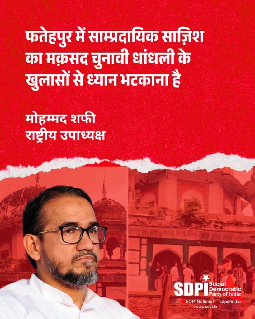 सोशल डेमोक्रेटिक पार्टी ऑफ इंडिया के राष्ट्रीय उपाध्यक्ष मोहम्मद शफी ने उत्तर प्रदेश के फतेहपुर ज़िले में अचानक और सुनियोजित तरीके से भड़काई गई साम्प्रदायिक तनाव की घटना पर गहरा सदमा और कड़ी नाराज़गी व्यक्त की है। हिंदुत्व उग्रवादियों ने अबू नगर स्थित एक ऐतिहासिक मकबरे को निशाना बनाकर उसे तोड़ा-फोड़ा और झूठा प्रचार किया कि यह एक प्राचीन मंदिर है। यह दुस्साहसिक कृत्य, जिसने समुदायों को हिंसा के कगार पर पहुँचा दिया, न केवल हिंदुस्तान के धर्मनिरपेक्ष ताने-बाने पर गंभीर हमला है बल्कि जानबूझकर विभाजन और नफ़रत फैलाने की साज़िश है।