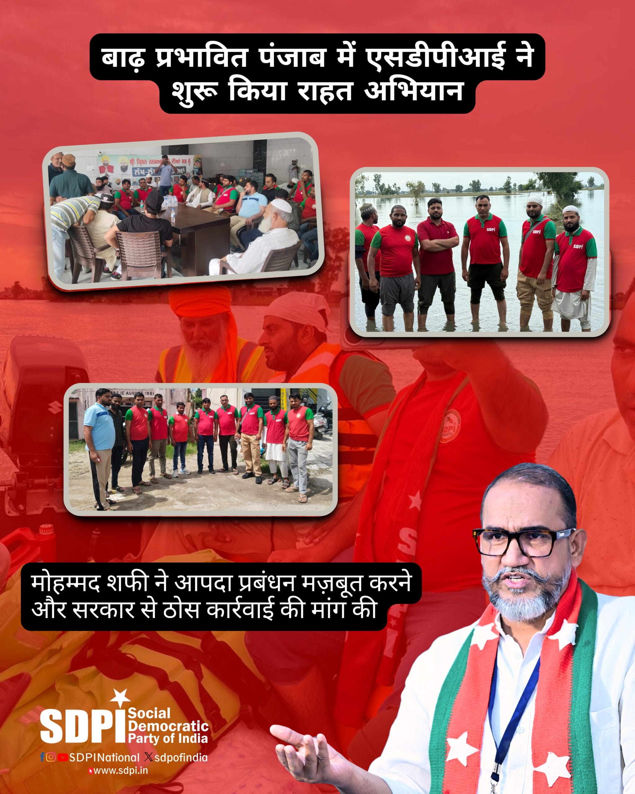 एसडीपीआई के राष्ट्रीय उपाध्यक्ष मोहम्मद शफी ने पार्टी सदस्यों से मानव सेवा को प्राथमिकता देने की अपील की। उन्होंने कहा, “पंजाब पीड़ा में है। गाँव जलमग्न हो गए, ज़िंदगियाँ खो गईं, घर ढह गए और खेत बर्बाद हो गए। इस संकट की घड़ी में एसडीपीआई मज़बूती से बाढ़ प्रभावित लोगों के साथ खड़ी है।” शफी ने स्थानीय प्रशासन और गैर-सरकारी संगठनों के साथ समन्वित कार्य की आवश्यकता पर बल दिया तथा किसानों को तात्कालिक सहायता प्रदान करने की मांग की, जिनकी फ़सलें बर्बाद होने से रोज़गार और खाद्य सुरक्षा दोनों पर गहरा संकट मंडरा रहा है।