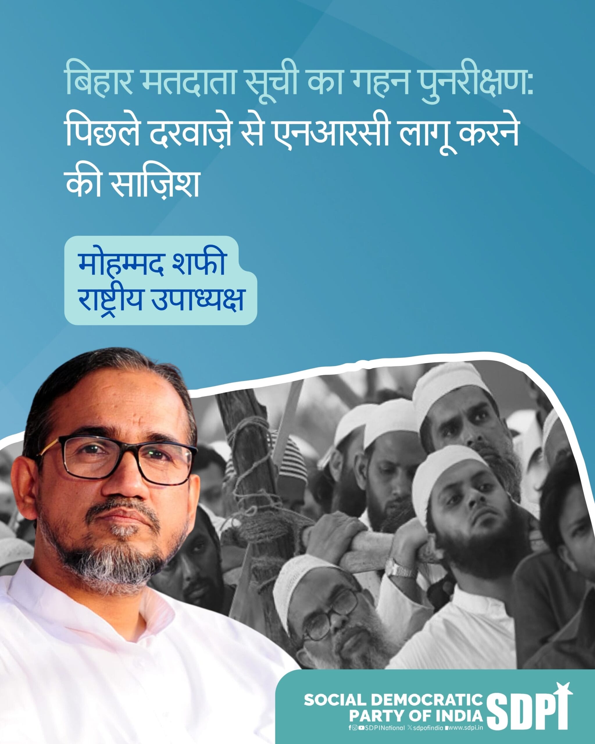 सोशल डेमोक्रेटिक पार्टी ऑफ इंडिया चुनाव आयोग से मांग करती है कि बिहार में शुरू की गई इस गहन मतदाता सूची पुनरीक्षण प्रक्रिया को तत्काल प्रभाव से स्थगित किया जाए। इस तरह की जल्दबाज़ी लाखों लोगों को मताधिकार से वंचित कर देगी, जो भारतीय लोकतंत्र की चुनावी प्रक्रिया पर एक गंभीर और अपूरणीय आघात होगा।