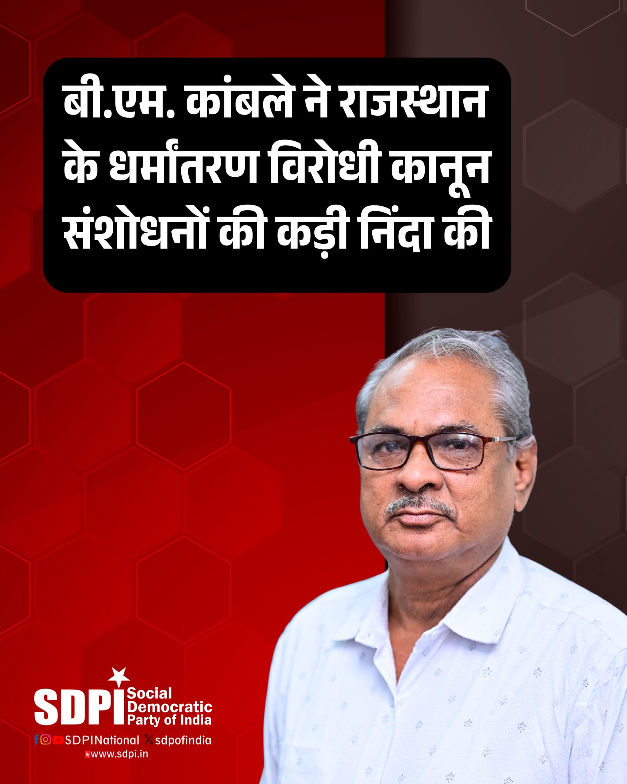 सोशल डेमोक्रेटिक पार्टी ऑफ इंडिया (SDPI) के राष्ट्रीय उपाध्यक्ष बी.एम. कांबले ने भजन लाल शर्मा के नेतृत्व वाली भाजपा सरकार द्वारा 31 अगस्त, 2025 को कैबिनेट में पारित और आज से शुरू हो रहे विधानसभा सत्र में पेश किए जाने वाले राजस्थान धार्मिक स्वतंत्रता अधिनियम (धर्मांतरण निषेध) संशोधनों की कड़ी निंदा की है। इन संशोधनों के तहत कथित जबरन धर्मांतरण पर आजीवन कारावास और 50 लाख रुपये तक का जुर्माना लगाने का प्रावधान है, जबकि “घर वापसी” (हिंदू धर्म में पुनः धर्मांतरण) को छूट दी गई है। यह भारत के संवैधानिक मूल्यों—धर्मनिरपेक्षता और धार्मिक स्वतंत्रता—पर सीधा हमला है और भाजपा के पाखंड को उजागर करता है, जो समाज को बांटने वाली बहुसंख्यकवादी राजनीति को बढ़ावा देती है।