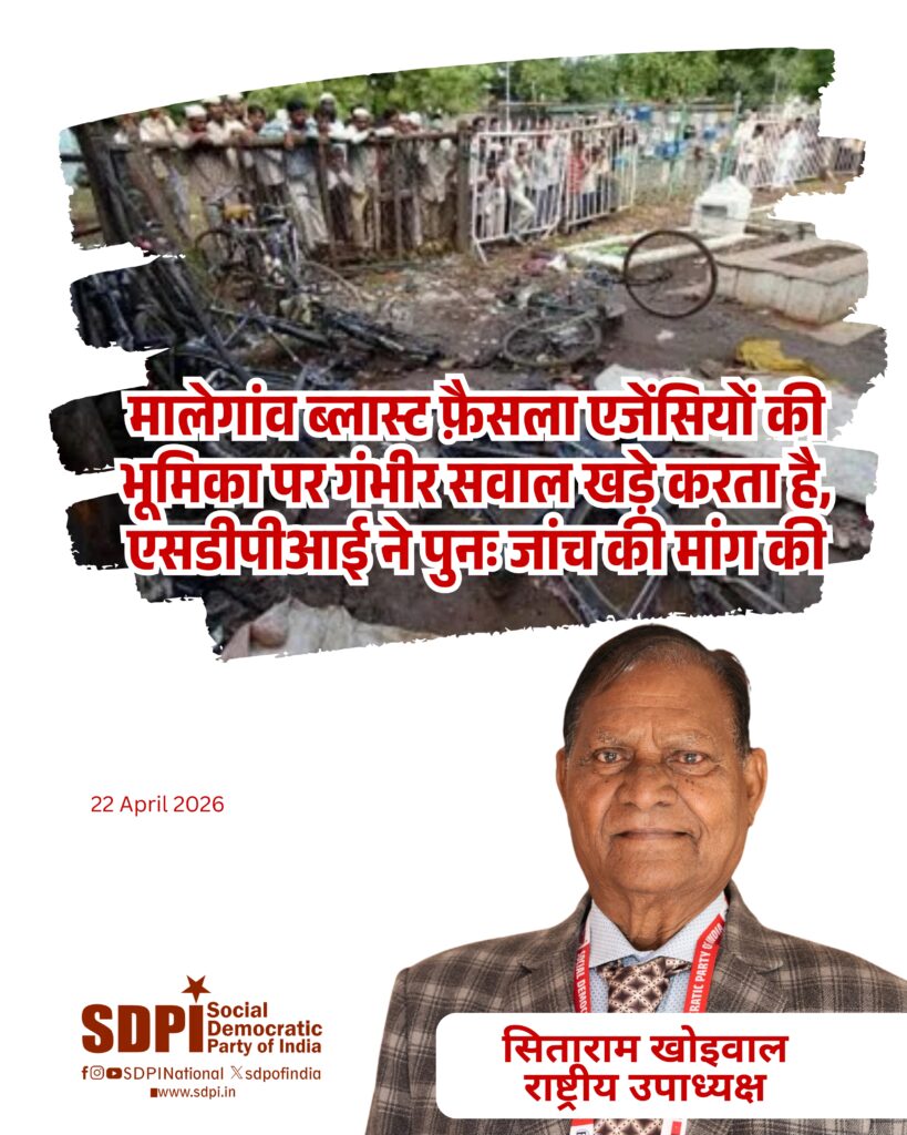 यह परिणाम व्यापक राजनीतिक परिप्रेक्ष्य से अलग नहीं किया जा सकता, जहाँ संवेदनशील मामलों की जांच प्रक्रियाओं पर सत्तारूढ़ शासन के प्रभाव को लेकर बार-बार चिंताएँ उठती रही हैं। आरोपों का कमजोर होना, महत्वपूर्ण साक्ष्यों का गायब होना और अभियोजन के रुख में बदलाव एक ऐसे पैटर्न की ओर संकेत करता है जिसकी तत्काल और गंभीर जांच आवश्यक है। मालेगांव के पीड़ितों को खामोशी और संस्थागत विफलता नहीं, बल्कि न्याय मिलना चाहिए। सोशल डेमोक्रेटिक पार्टी ऑफ इंडिया एक समयबद्ध, स्वतंत्र और न्यायिक निगरानी में पुनः जांच की सशक्त मांग करती है, ताकि पूरे सत्य को सामने लाया जा सके और जिम्मेदार लोगों को, चाहे उनकी विचारधारा या राजनीतिक संरक्षण कुछ भी हो, कानून के अनुसार सज़ा दी जा सके।