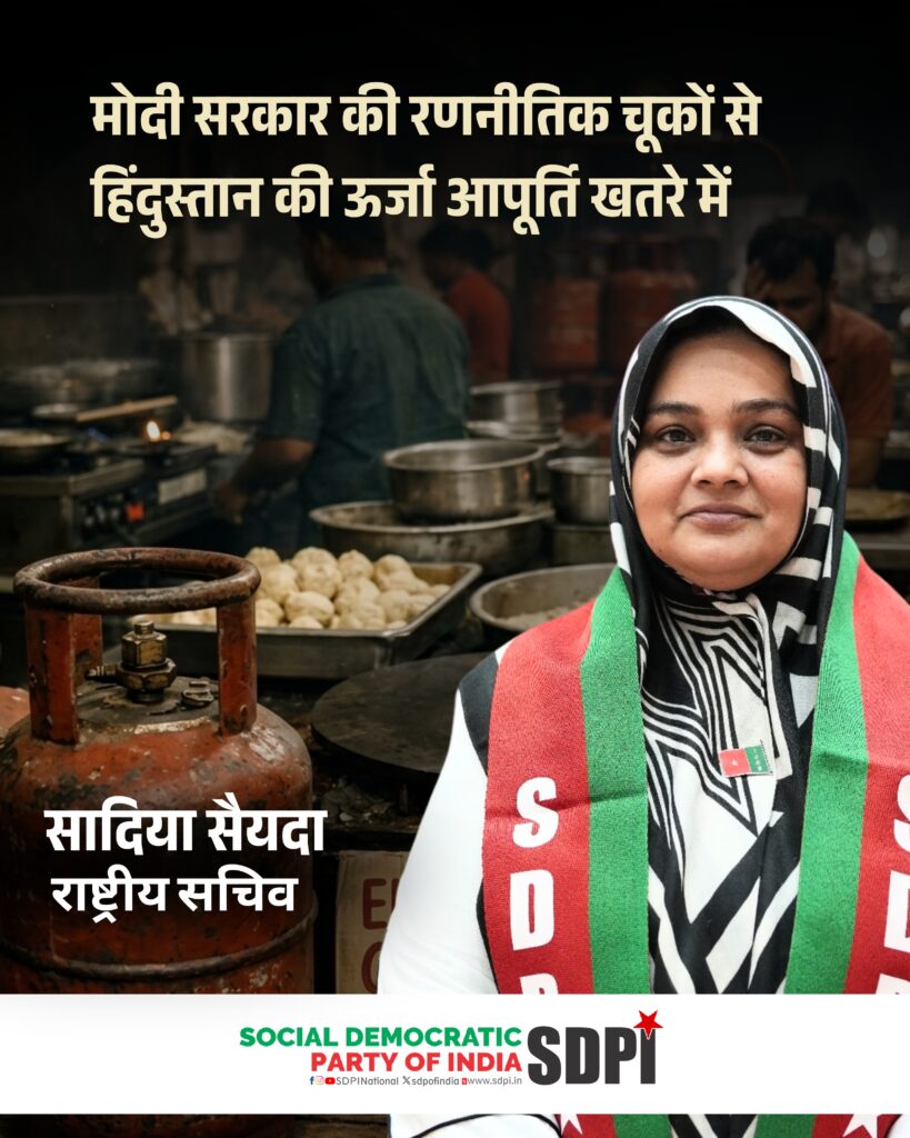 सोशल डेमोक्रेटिक पार्टी ऑफ इंडिया की राष्ट्रीय सचिव सादिया सैयदा ने देश में गहराते ईंधन संकट के लिए मोदी सरकार को जिम्मेदार ठहराया है। उन्होंने कहा कि यह संकट अब पूरे देश में घरों, छोटे कारोबारों और आतिथ्य क्षेत्र को प्रभावित कर रहा है। उनके अनुसार प्रधानमंत्री नरेंद्र मोदी की हालिया इस्राइल यात्रा और बेंजामिन नेतन्याहू की सरकार के साथ व्यापक सैन्य समझौतों पर हस्ताक्षर करने से ईरान के साथ हिंदुस्तान के लंबे समय से चले आ रहे रणनीतिक संबंधों में तनाव पैदा हुआ है। उनका कहना है कि इस बदलाव ने हिंदुस्तान की कूटनीतिक संतुलन नीति को कमजोर किया है और पश्चिम एशिया में बढ़ते तनाव के समय देश के ऊर्जा हितों की सुरक्षा को प्रभावित किया है।