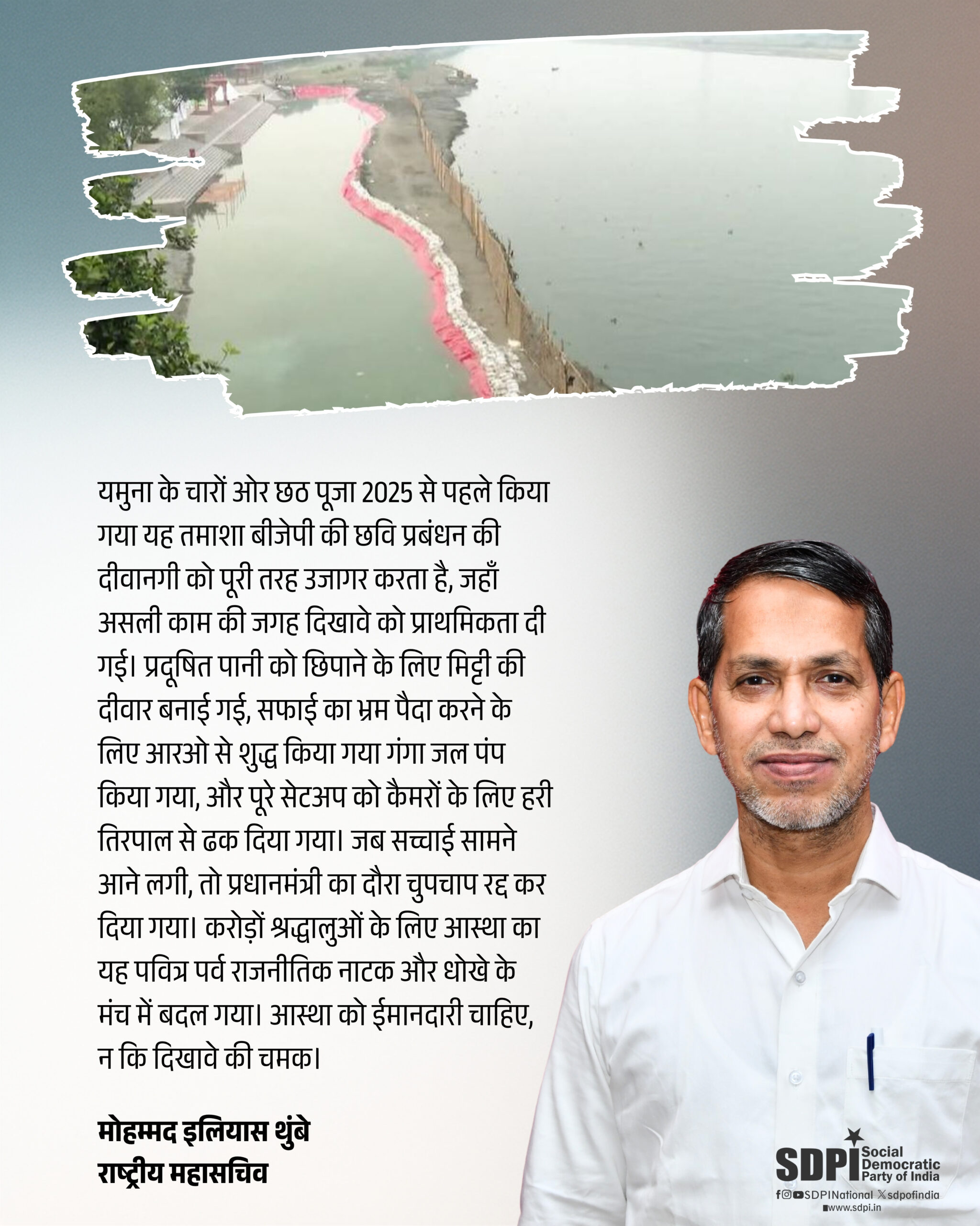 यमुना के चारों ओर छठ पूजा 2025 से पहले किया गया यह तमाशा बीजेपी की छवि प्रबंधन की दीवानगी को पूरी तरह उजागर करता है, जहाँ असली काम की जगह दिखावे को प्राथमिकता दी गई। प्रदूषित पानी को छिपाने के लिए मिट्टी की दीवार बनाई गई, सफाई का भ्रम पैदा करने के लिए आरओ से शुद्ध किया गया गंगा जल पंप किया गया, और पूरे सेटअप को कैमरों के लिए हरी तिरपाल से ढक दिया गया। जब सच्चाई सामने आने लगी, तो प्रधानमंत्री का दौरा चुपचाप रद्द कर दिया गया। करोड़ों श्रद्धालुओं के लिए आस्था का यह पवित्र पर्व राजनीतिक नाटक और धोखे के मंच में बदल गया। आस्था को ईमानदारी चाहिए, न कि दिखावे की चमक।