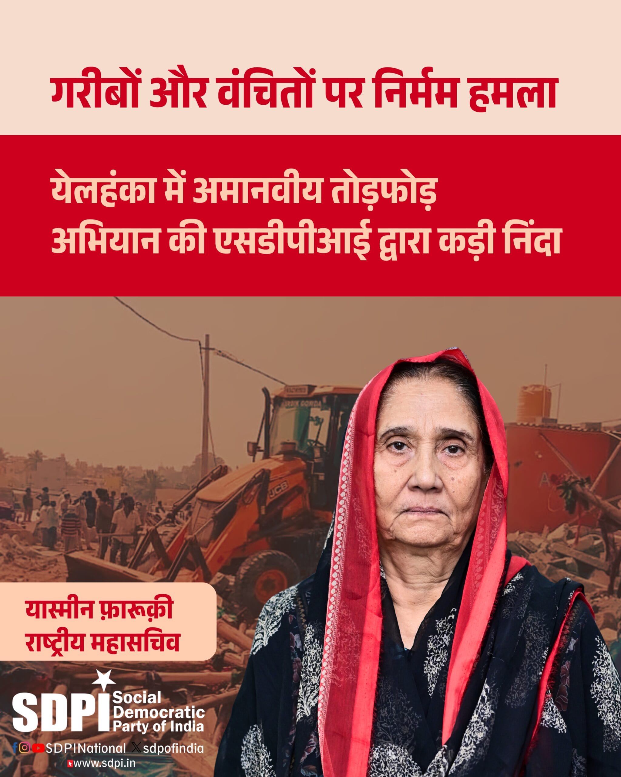 सोशल डेमोक्रेटिक पार्टी ऑफ इंडिया येलहंका, बेंगलुरु के कोगिलु लेआउट में 20 दिसंबर 2025 को ग्रेटर बेंगलुरु प्राधिकरण और बेंगलुरु सॉलिड वेस्ट मैनेजमेंट लिमिटेड द्वारा चलाए गए निष्ठुर और अमानवीय तोड़फोड़ अभियान की कड़े शब्दों में निंदा करती है। भोर से पहले चलाए गए इस अभियान में 300 से अधिक ढांचों को ध्वस्त कर दिया गया और 350 से अधिक परिवार बेघर हो गए। प्रभावित निवासी मुख्य रूप से मुस्लिम फकीर समुदाय के हैं, जो पिछले दो दशकों से अधिक समय से इस क्षेत्र में रह रहे थे। यह कार्रवाई न्याय, मानवता और हाशिए पर पड़े समुदायों के संवैधानिक अधिकारों के साथ गंभीर विश्वासघात है।