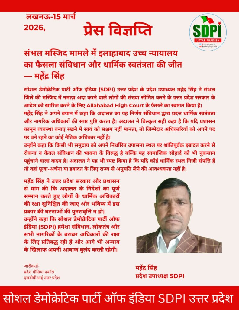 सोशल डेमोक्रेटिक पार्टी ऑफ इंडिया (SDPI) उत्तर प्रदेश के प्रदेश उपाध्यक्ष महेंद्र सिंह ने संभल जिले की मस्जिद में नमाज़ अदा करने वाले लोगों की संख्या सीमित करने के उत्तर प्रदेश सरकार के आदेश को खारिज करने के लिए Allahabad High Court के फैसले का स्वागत किया है।