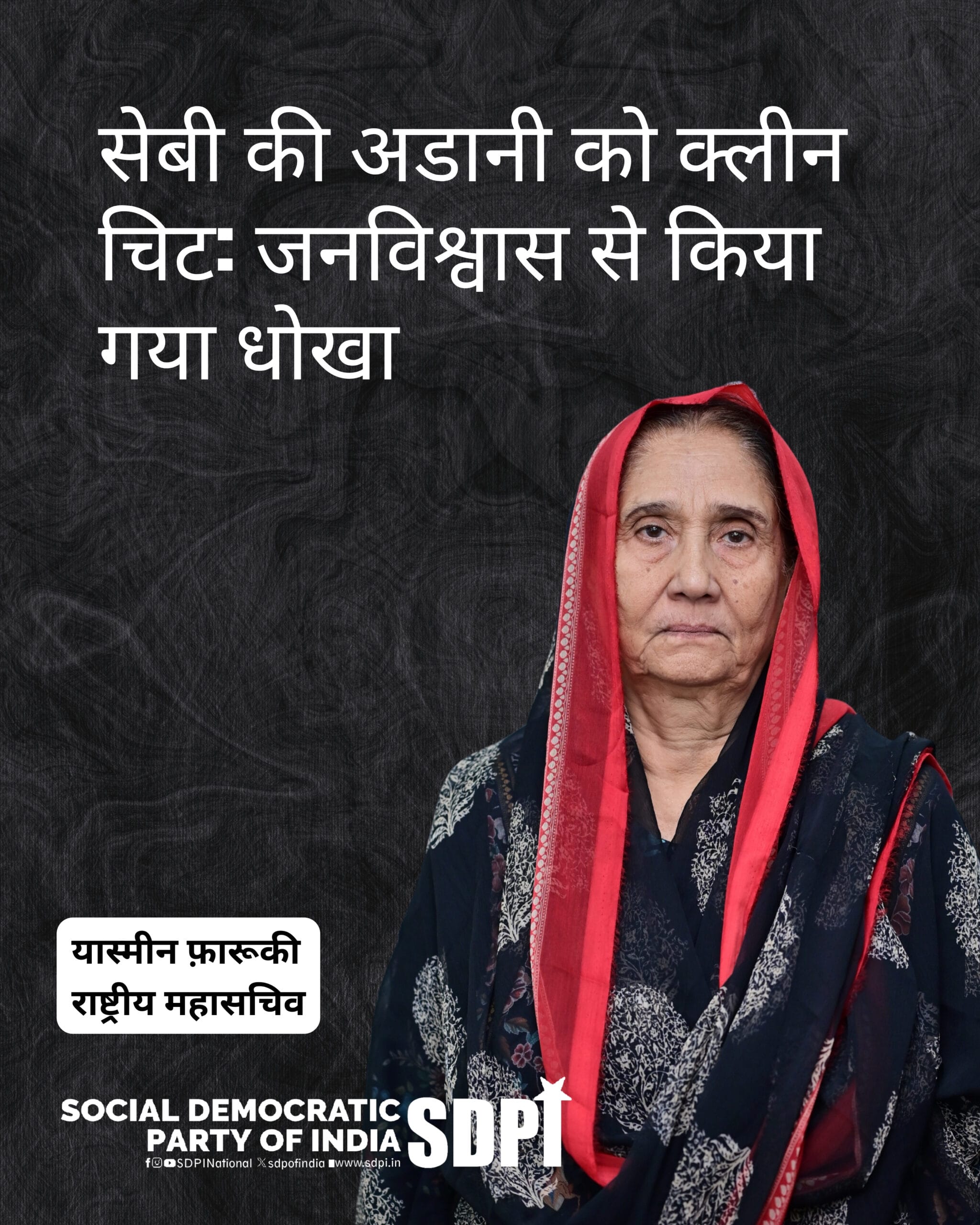 सोशल डेमोक्रेटिक पार्टी ऑफ इंडिया (एसडीपीआई) की राष्ट्रीय महासचिव यास्मीन फारूकी ने भारतीय प्रतिभूति और विनिमय बोर्ड (सेबी) द्वारा हिंडनबर्ग रिसर्च के आरोपों में अडानी समूह को तथाकथित “क्लीन चिट” देने की कड़ी निंदा की है। यह फैसला संस्थागत पक्षपात की बू देता है और आम भारतीयों तथा हिन्दुस्तान की अर्थव्यवस्था की कीमत पर चहेते पूंजीपतियों को बचाने का एक सुनियोजित प्रयास है।