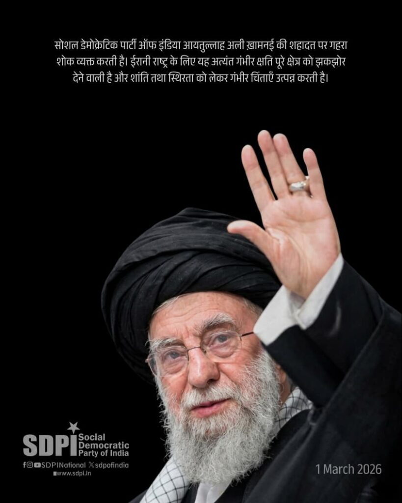 सोशल डेमोक्रेटिक पार्टी ऑफ इंडिया आयतुल्लाह अली ख़ामनई की शहादत पर गहरा शोक व्यक्त करती है। ईरानी राष्ट्र के लिए यह अत्यंत गंभीर क्षति पूरे क्षेत्र को झकझोर देने वाली है और शांति तथा स्थिरता को लेकर गंभीर चिंताएँ उत्पन्न करती है।