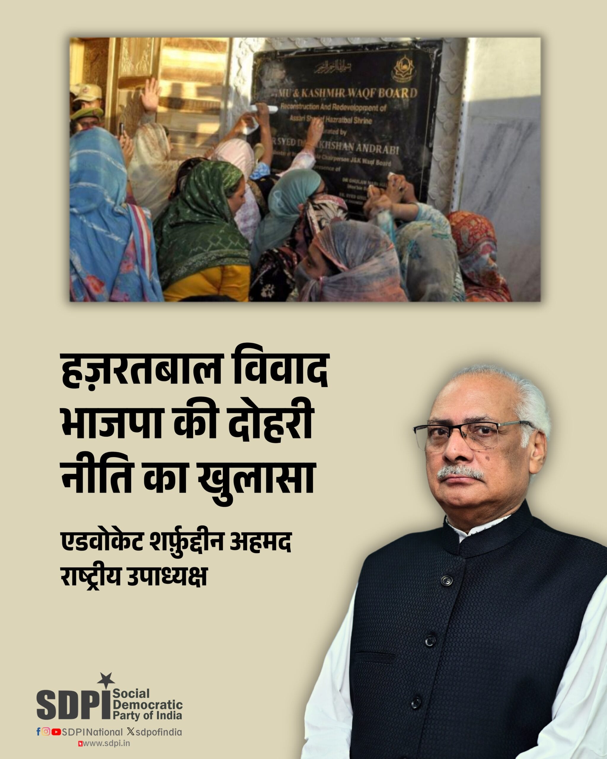 सोशल डेमोक्रेटिक पार्टी ऑफ इंडिया हज़रतबाल प्रकरण के लिए जवाबदेही तय करने, सभी बंदियों की रिहाई और धार्मिक स्थलों से भड़काऊ प्रतीकों को हटाने की माँग करती है। मोदी सरकार को चाहिए कि कश्मीर को साम्प्रदायिक प्रयोगों की प्रयोगशाला बनाना बंद करे और इसकी बहुलतावादी परंपराओं का सम्मान करे। घाटी के लोग गरिमा, न्याय और अमन के हक़दार हैं, न कि उकसावे और दमन के।