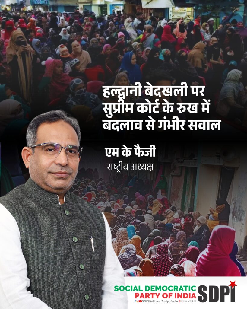 सोशल डेमोक्रेटिक पार्टी ऑफ इंडिया ने 24 फरवरी 2026 को हल्द्वानी रेलवे भूमि मामले में सुप्रीम कोर्ट द्वारा दिए गए फैसले पर गहरी चिंता व्यक्त की है। यह निर्णय वर्ष 2024 में न्यायालय द्वारा अपनाए गए मानवीय दृष्टिकोण से अलग दिखाई देता है। इस बदलाव से बनभूलपुरा के लगभग पचास हजार निवासियों, जिनमें अधिकतर गरीब और लंबे समय से बसे परिवार शामिल हैं, के भविष्य पर गंभीर खतरा मंडरा रहा है। साथ ही यह पूरे हिंदुस्तान में वंचित और हाशिए पर खड़े समुदायों के अधिकारों को लेकर एक चिंताजनक संदेश देता है। जुलाई और सितंबर 2024 में न्यायालय ने स्पष्ट कहा था कि किसी भी बेदखली से पहले पुनर्वास सुनिश्चित किया जाना चाहिए और यह भी टिप्पणी की थी कि प्रभावित लोग भी इंसान हैं। न्यायालय ने उत्तराखंड सरकार, केंद्र सरकार और रेलवे को व्यापक पुनर्वास योजना तैयार करने का निर्देश दिया था, यह स्वीकार करते हुए कि दशकों से वहां रह रहे परिवारों को हटाने की मानवीय कीमत अत्यंत गंभीर होगी, जहां स्कूल, इबादतगाहें और सामुदायिक संस्थाएं स्थापित हैं।