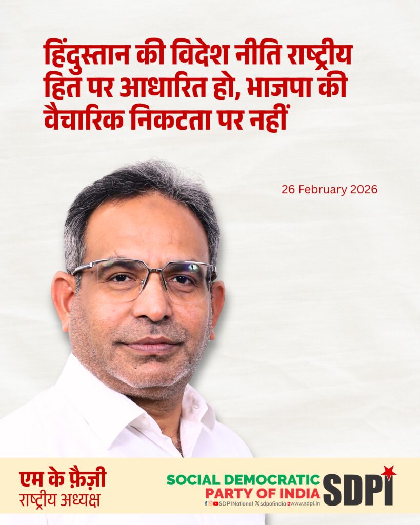 सोशल डेमोक्रेटिक पार्टी ऑफ इंडिया के राष्ट्रीय अध्यक्ष एम के फ़ैज़ी ने प्रधानमंत्री नरेंद्र मोदी की इज़राइल यात्रा पर गंभीर आपत्ति व्यक्त की है। उन्होंने कहा कि जब अधिकृत फ़िलिस्तीनी क्षेत्र, विशेषकर ग़ज़ा, अभूतपूर्व मानवीय त्रासदी से गुजर रहा है, ऐसे समय में यह यात्रा हिंदुस्तान की ऐतिहासिक, संतुलित और स्वतंत्र विदेश नीति से विचलन को दर्शाती है। ग़ज़ा में जारी व्यापक विनाश और नागरिकों की पीड़ा के बीच रक्षा सहयोग और रणनीतिक निकटता को प्राथमिकता देना राष्ट्रीय हितों के अनुरूप नहीं है।