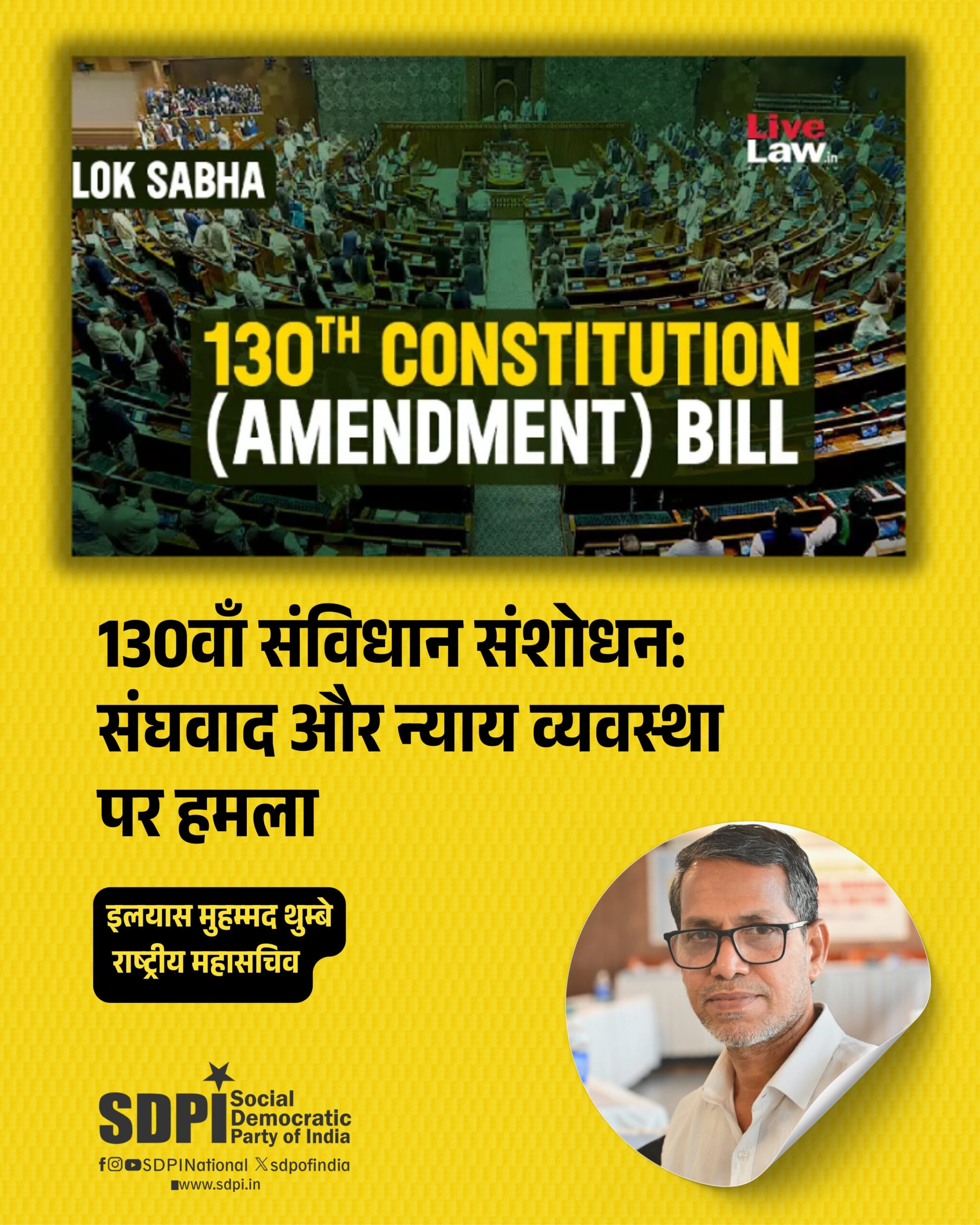 सोशल डेमोक्रेटिक पार्टी ऑफ़ इंडिया के राष्ट्रीय महासचिव इलयास मुहम्मद थुम्बे ने लोकसभा में केंद्रीय गृहमंत्री अमित शाह द्वारा प्रस्तुत संविधान (130वाँ संशोधन) विधेयक, 2025, सरकार प्रशासनिक प्रदेश (संशोधन) विधेयक, 2025 और जम्मू-कश्मीर पुनर्गठन (संशोधन) विधेयक, 2025 की कड़े शब्दों में निंदा की है। ये विधेयक लोकतंत्र, संघवाद और क़ानून के शासन पर खुला हमला हैं। ये कुछ और नहीं बल्कि भाजपा नेतृत्व वाली केंद्र सरकार के हाथों में तानाशाही सत्ता को केंद्रीकृत करने के औज़ार हैं, जो चुने हुए जनप्रतिनिधियों के अधिकारों और जनता की इच्छा को कुचलते हैं।