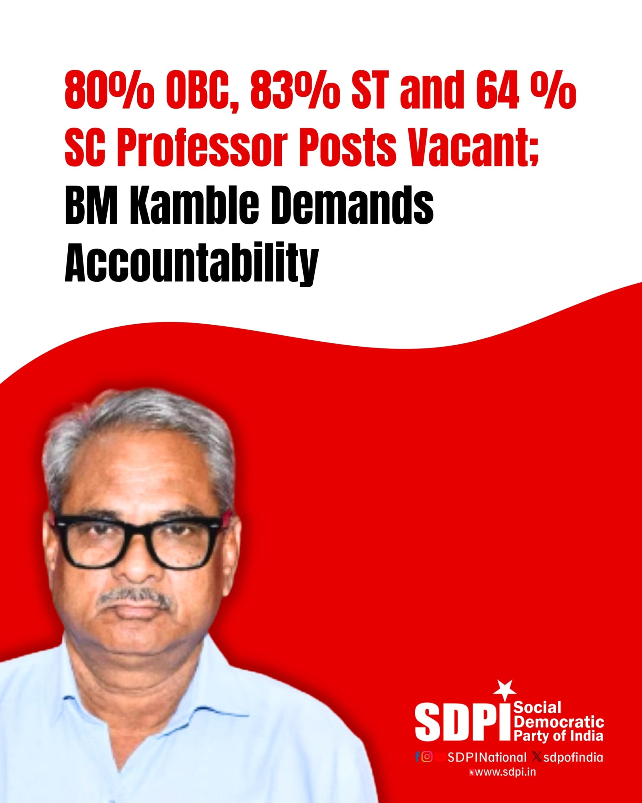 BM Kamble, National Vice President of the Social Democratic Party of India unequivocally condemns the Central Government’s failure to address the shocking backlog of reserved faculty posts in central universities, a blatant violation of social justice principles enshrined in the Constitution. Government data presented in the Rajya Sabha on July 24, 2025, reveals an alarming reality: 80% of Other Backward Classes (OBC) professor posts (339 out of 423) and 83% of Scheduled Tribes (ST) professor posts (120 out of 144) remain vacant. Scheduled Castes (SC) fare no better, with a 64% vacancy rate (197 out of 308 posts). In stark contrast, only 39% of general category professor posts are unfilled, exposing a systemic bias that undermines the Central Educational Institutions (Reservation in Teachers’ Cadre) Act, 2006.