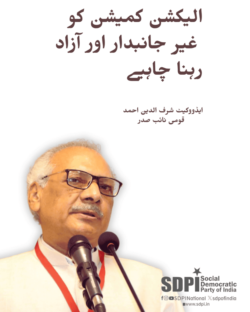 نئی دہلی۔ (پریس ریلیز)۔ سوشیل ڈیموکریٹک پارٹی آف انڈیا (ایس ڈی پی آئی) کے قومی نائب صدر اڈوکیٹ شرف الدین احمد نے اپنے جاری کردہ اخباری بیان میں کہا ہے کہ ہندوستان میں جمہوری نظام کی بنیاد انتخابی عمل کی غیر جانبداری اور شفافیت پرقائم ہے۔ الیکشن کمیشن آف انڈیا کی آئینی ذمہ داری ہے کہ وہ اس عمل کو غیر جانبدارانہ اور آزادانہ طور پر انجام دے۔ لیکن کچھ حالیہ پیش رفت نے کمیشن کی غیر جانبداری اور آزادی پر سنگین سوالات اٹھائے ہیں۔