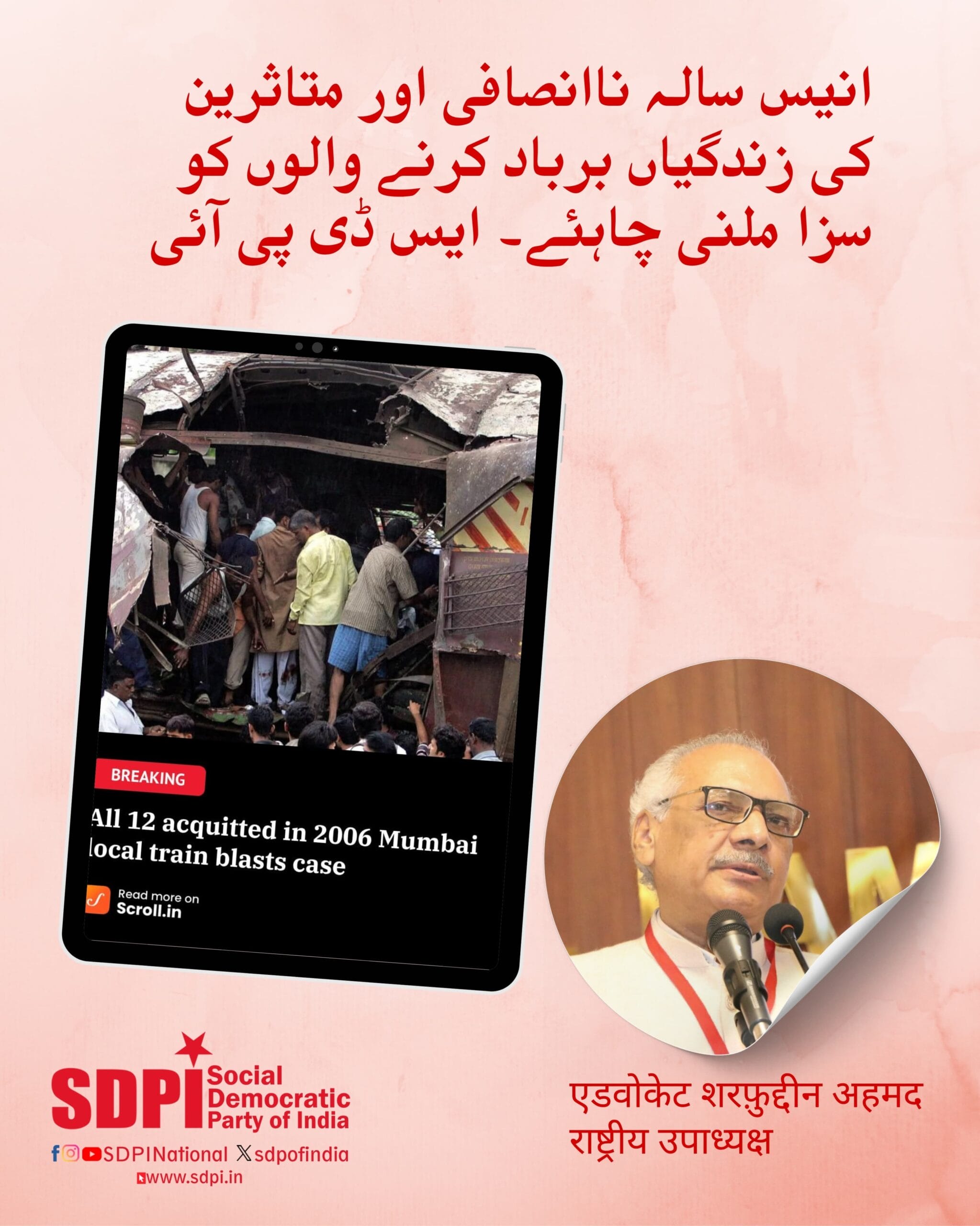نئی دہلی۔ (پریس ریلیز)۔ سوشیل ڈیموکریٹک پارٹی آف انڈیا کے قومی نائب صدر اڈوکیٹ شرف الدین احمد نے اپنے جاری کردہ اخباری بیان میں کہا ہے کہ 21 جولائی 2025 کو بمبئی ہائی کورٹ کے ذریعہ 2006 کے ممبئی ٹرین دھماکوں کے کیس میں بری کیے گئے 12 بے گناہ افراد کے ساتھ پارٹی مضبوط یکجہتی میں کھڑی ہے۔ 19 سال کی غلط قید کے بعد ان کی رہائی انصاف کے خوفناک چوک کو بے نقاب کرتی ہے، جسے مہاراشٹرا انسداد دہشت گردی اسکواڈ (ATS) نے ترتیب دیا تھا اور یکے بعد دیگرے آنے والی حکومتوں کے ذریعے سہولت فراہم کی گئی تھی جنہوں نے فرقہ وارانہ تعصب کو قانون کی حکمرانی پر غالب آنے دیا۔
