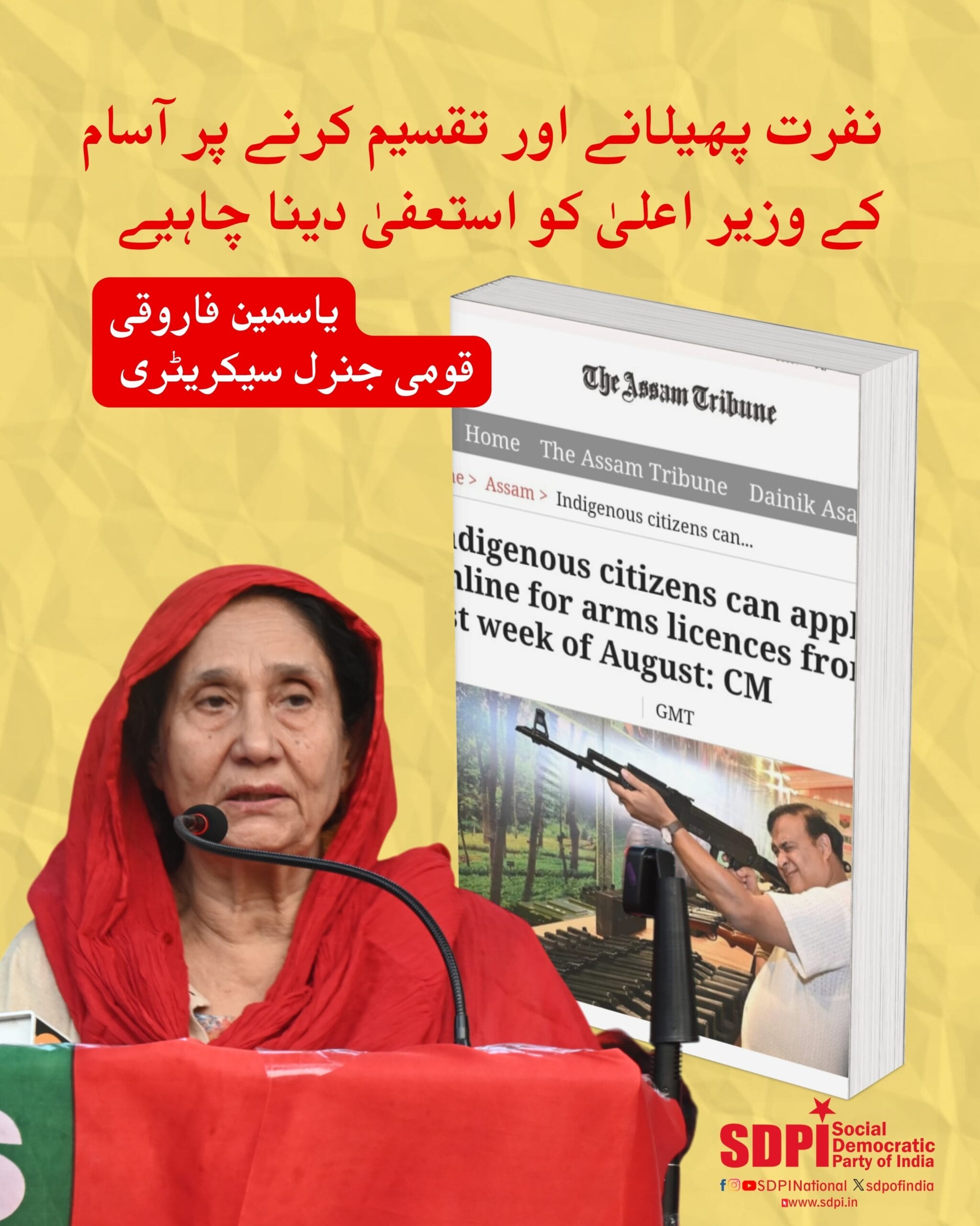 نئی دہلی۔ (پریس ریلیز)۔ سوشیل ڈیموکریٹک پارٹی آف انڈیا کی قومی جنرل سکریٹری یاسمین فاروقی نے فرقہ وارانہ ہم آہنگی اور آئینی اقدار کو مجروح کرنے والی ان کی تفرقہ انگیز اور خطرناک پالیسیوں کا حوالہ دیتے ہوئے ہمنتا بسو ا شرما سے آسام کے وزیر اعلیٰ کے عہدے سے فوری طور پر مستعفی ہونے کا مطالبہ کیا ہے۔ 1 اگست 2025 سے خصوصی طور پر ”دیسی” باشندوں کو بندوق کے لائسنس جاری کرنے کا ان کا حالیہ اعلان، آسام میں ”دھماکہ خیز صورتحال” کے بارے میں ان کی اشتعال انگیز انتباہ کے ساتھ، امن اور جمہوریت کے لیے سنگین خطرہ ہے۔