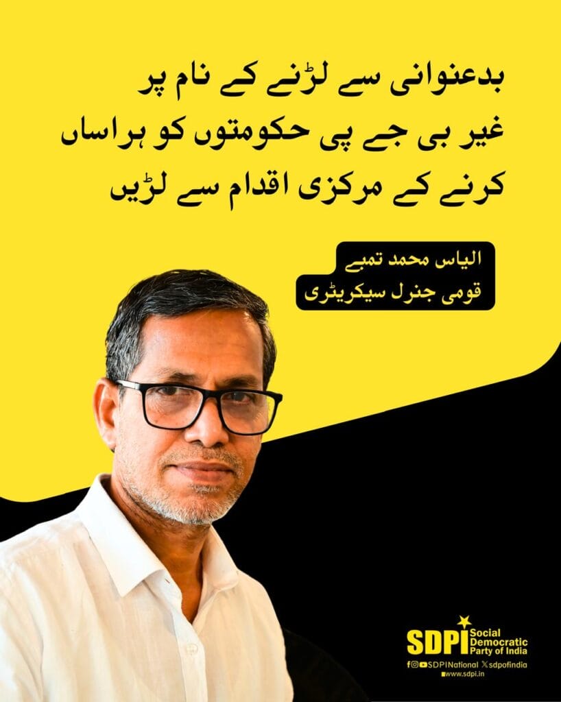 نئی دہلی۔(پریس ریلیز)۔ سوشیل ڈیموکریٹک پارٹی آف انڈیا کے قومی جنرل سکریٹری الیاس محمد تمبے نے اپنے جاری کردہ اخباری بیان میں کہا ہے کہ