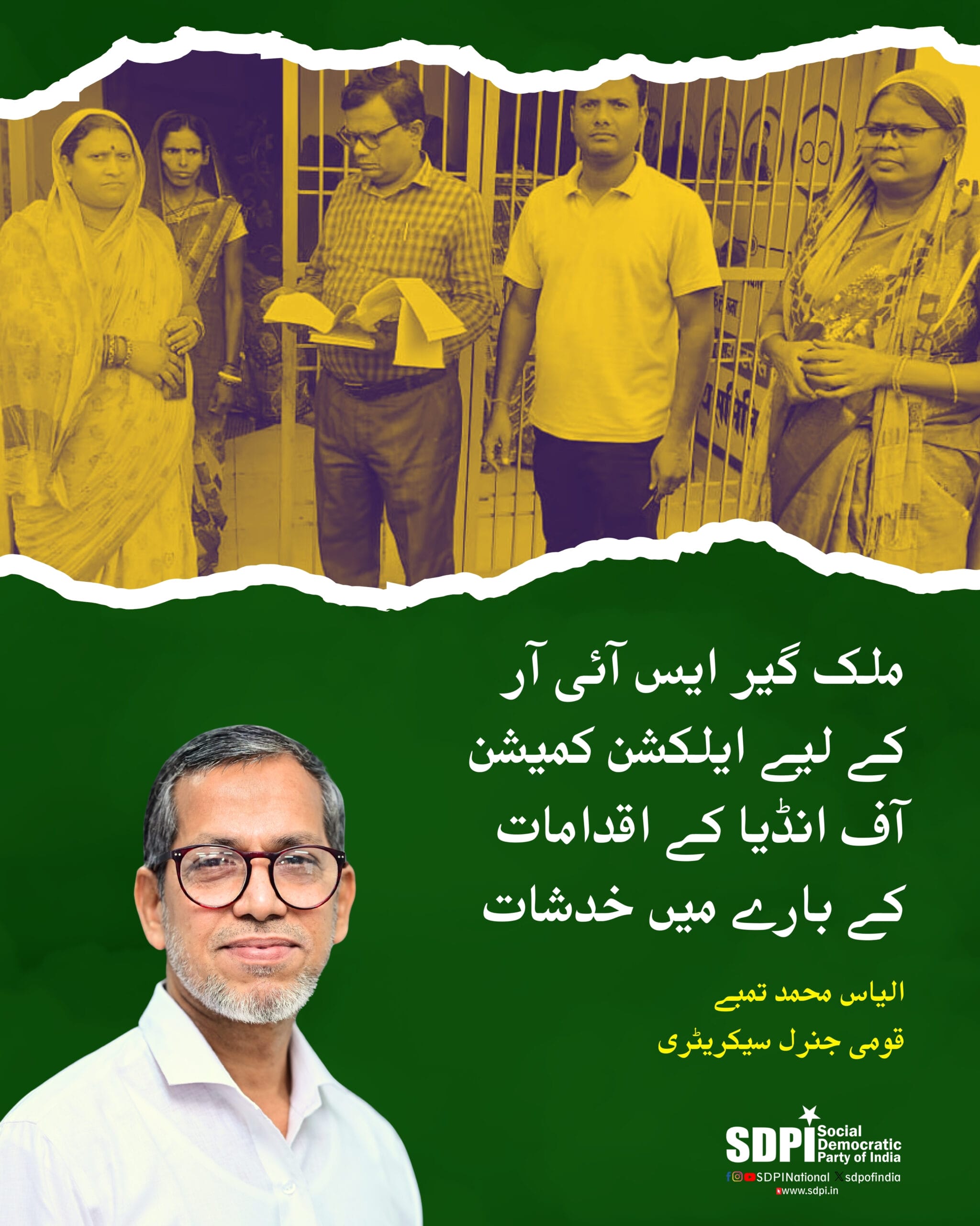 نئی دہلی۔ (پریس ریلیز)۔ سوشیل ڈیموکریٹک پارٹی آف انڈیا کے قومی جنرل سکریٹری الیاس محمد تمبے نے اپنے جاری کردہ اخباری بیان میں کہا ہے کہ الیکشن کمیشن کی ملک گیر ایس آئی آر کرانے کی منصوبہ بندی باعث تشویش ہے۔ الیکشن کمیشن کی 10 ستمبر کو ہونے والی میٹنگ، جس میں تمام ریاستوں اور مرکز کے زیر انتظام علاقوں کے چیف الیکٹورل افسران شرکت کریں گے، کا مقصد ملک گیر اسپیشل انٹینسیو ریویژن (SIR) کی منصوبہ بندی کرنا ہے، جیسا کہ حال ہی میں بہار میں آئندہ اسمبلی انتخابات سے قبل منعقد کیا گیا تھا۔