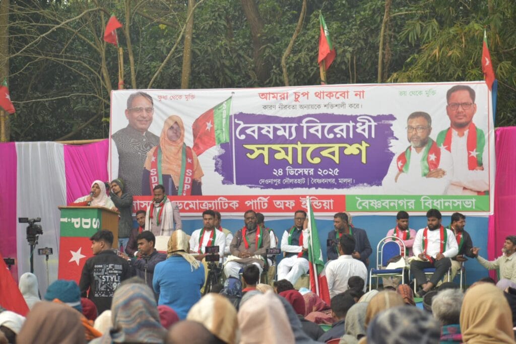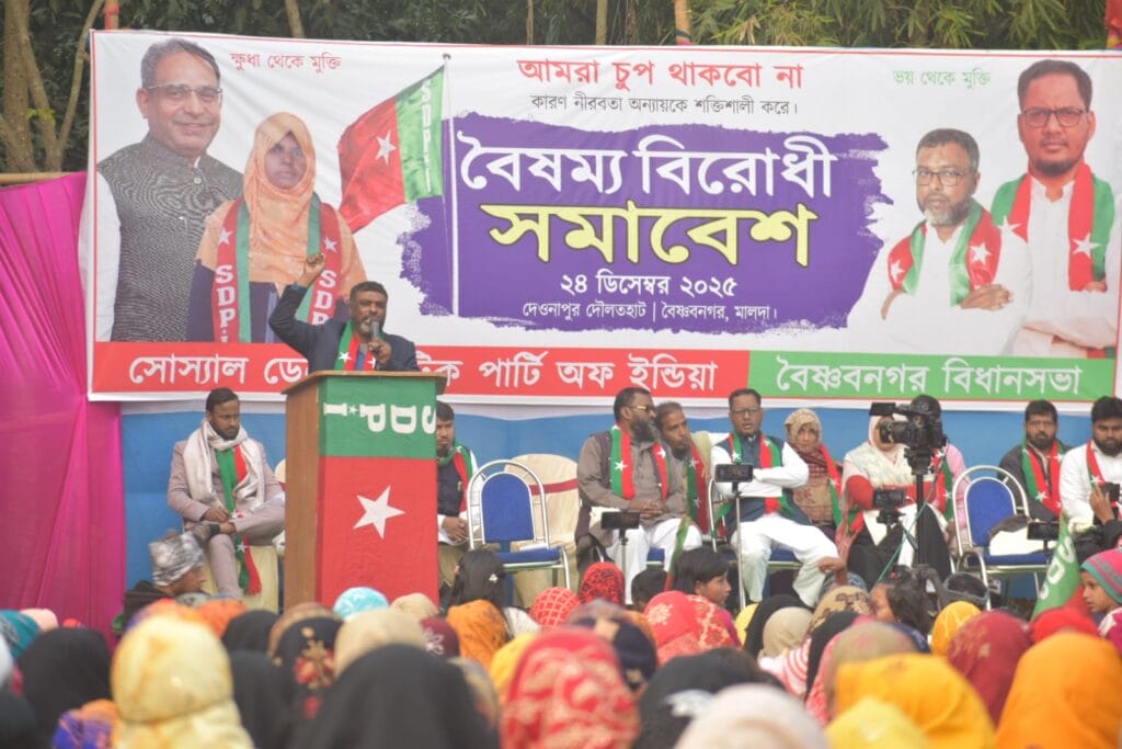 Today, a large anti-discrimination Conference of the Social Democratic Party of India (SDPI) was held at Daulathat under the Par Deonapur–Shobhabpur Gram Panchayat in the Vaishnabnagar Assembly constituency of Malda district. The Conference was organized with demands to protect the Constitution, safeguard fundamental and constitutional rights, ensure OBC rights, and protect Waqf properties.