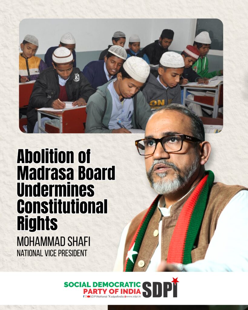 Mohammad Shafi, National Vice President of the Social Democratic Party of India, has strongly condemned the decision of Pushkar Singh Dhami led government to abolish the Madrasa Board in Uttarakhand and mandate a uniform curriculum under the state education system. Projected as a step toward modernization and integration, the move raises serious constitutional concerns, particularly with regard to Articles 25 to 30, which guarantee minorities the right to manage their educational and religious institutions. The dismantling of a statutory body established in 2016 disregards institutional continuity and the educational needs of thousands of students.