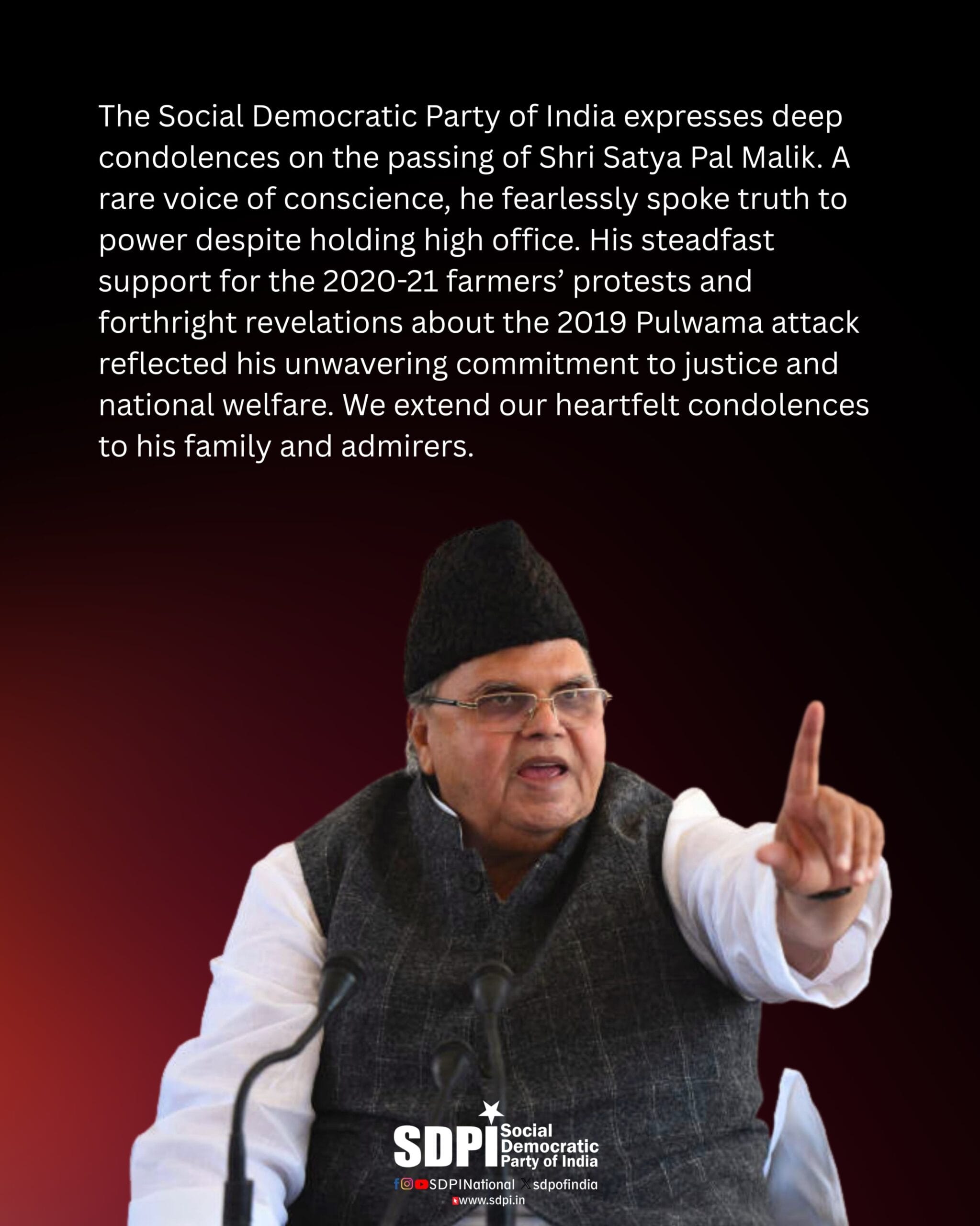 The Social Democratic Party of India expresses deep condolences on the passing of Shri Satya Pal Malik. A rare voice of conscience, he fearlessly spoke truth to power despite holding high office. His steadfast support for the 2020-21 farmers’ protests and forthright revelations about the 2019 Pulwama attack reflected his unwavering commitment to justice and national welfare. We extend our heartfelt condolences to his family and admirers.