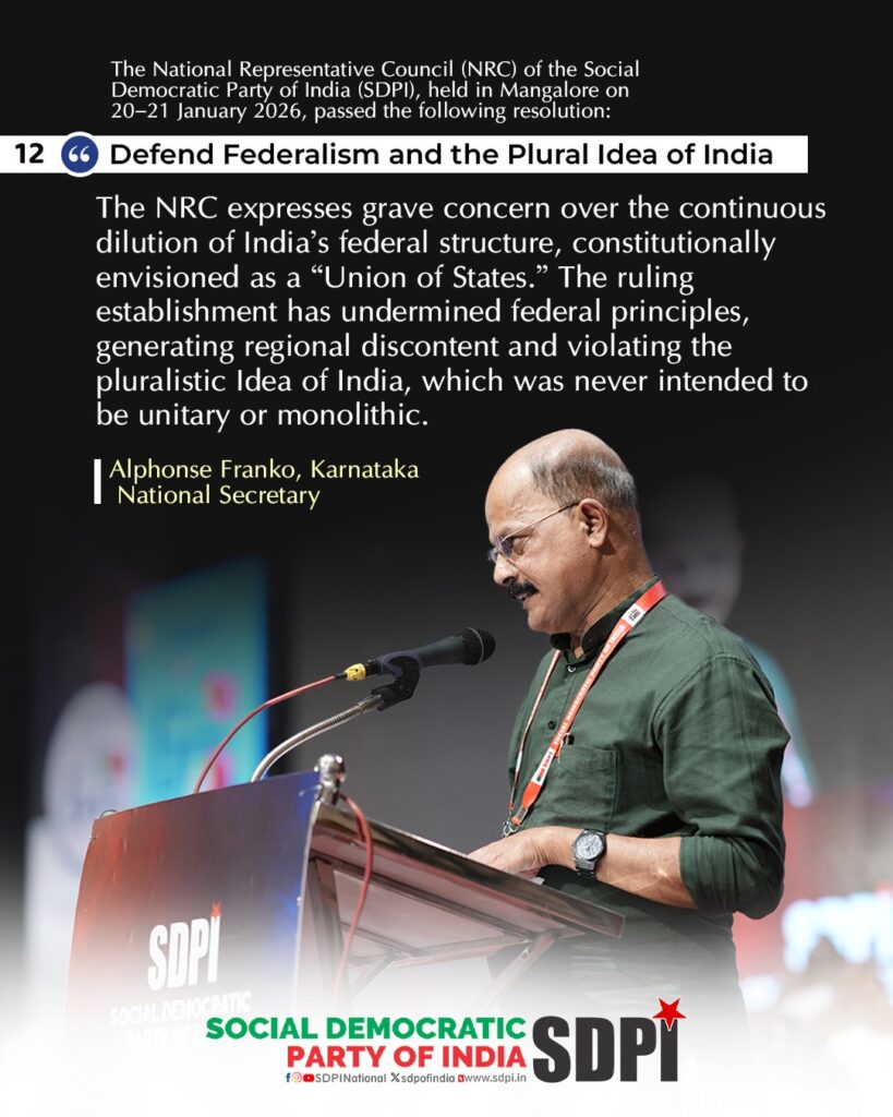 The NRC expresses grave concern over the continuous dilution of India’s federal structure, constitutionally envisioned as a “Union of States.” The ruling establishment has undermined federal principles, generating regional discontent and violating the pluralistic Idea of India, which was never intended to be unitary or monolithic.